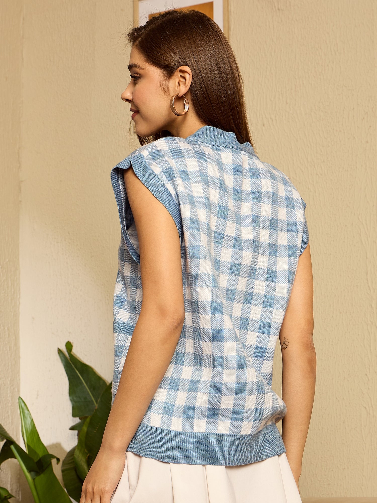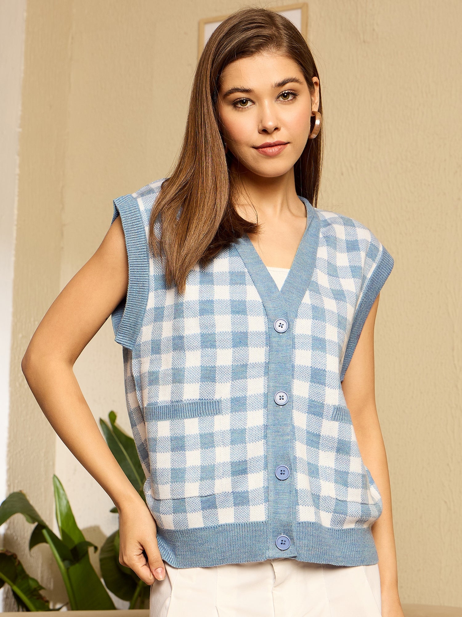 Berrylush Women Blue & White Checked Print V-Neck Sleeveless Front Button-Up Acrylic Straight Hem Knitted Regular Cardigan