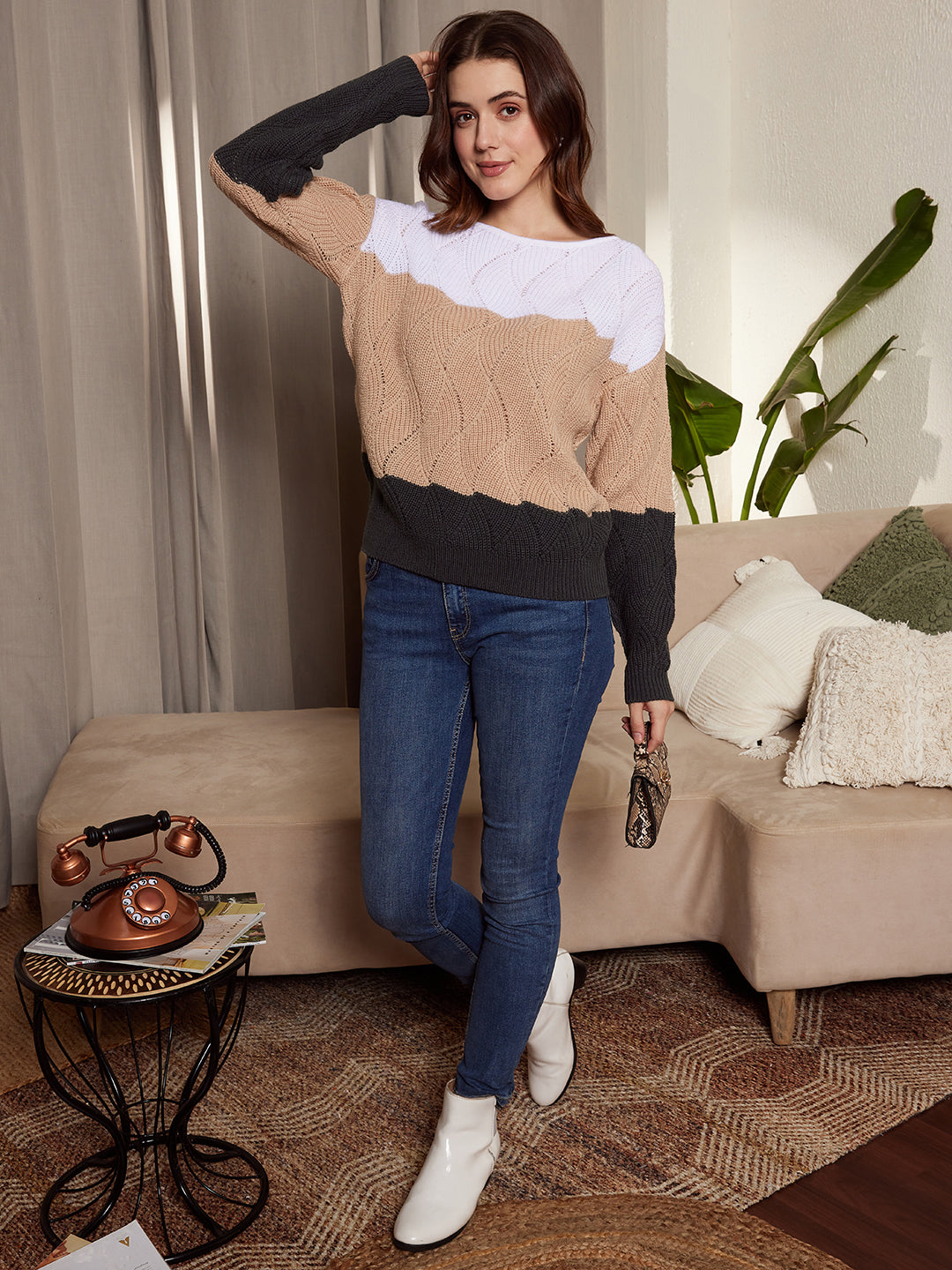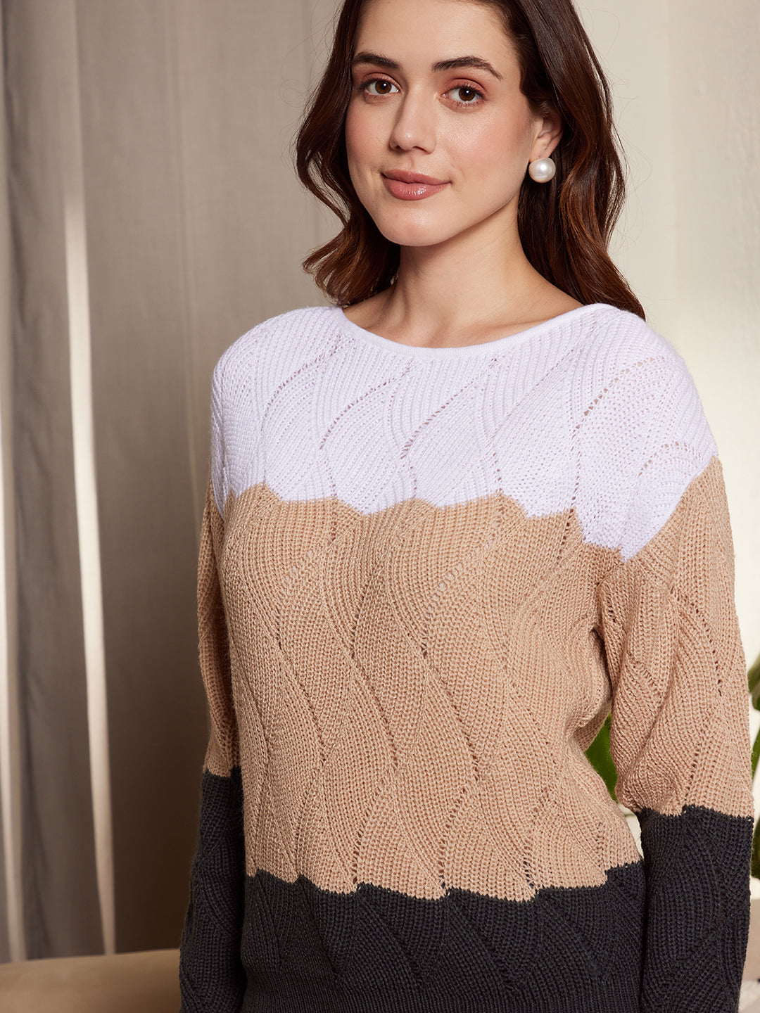 - White, beige, and black colour-blocked pattern gives this sweater a charming style