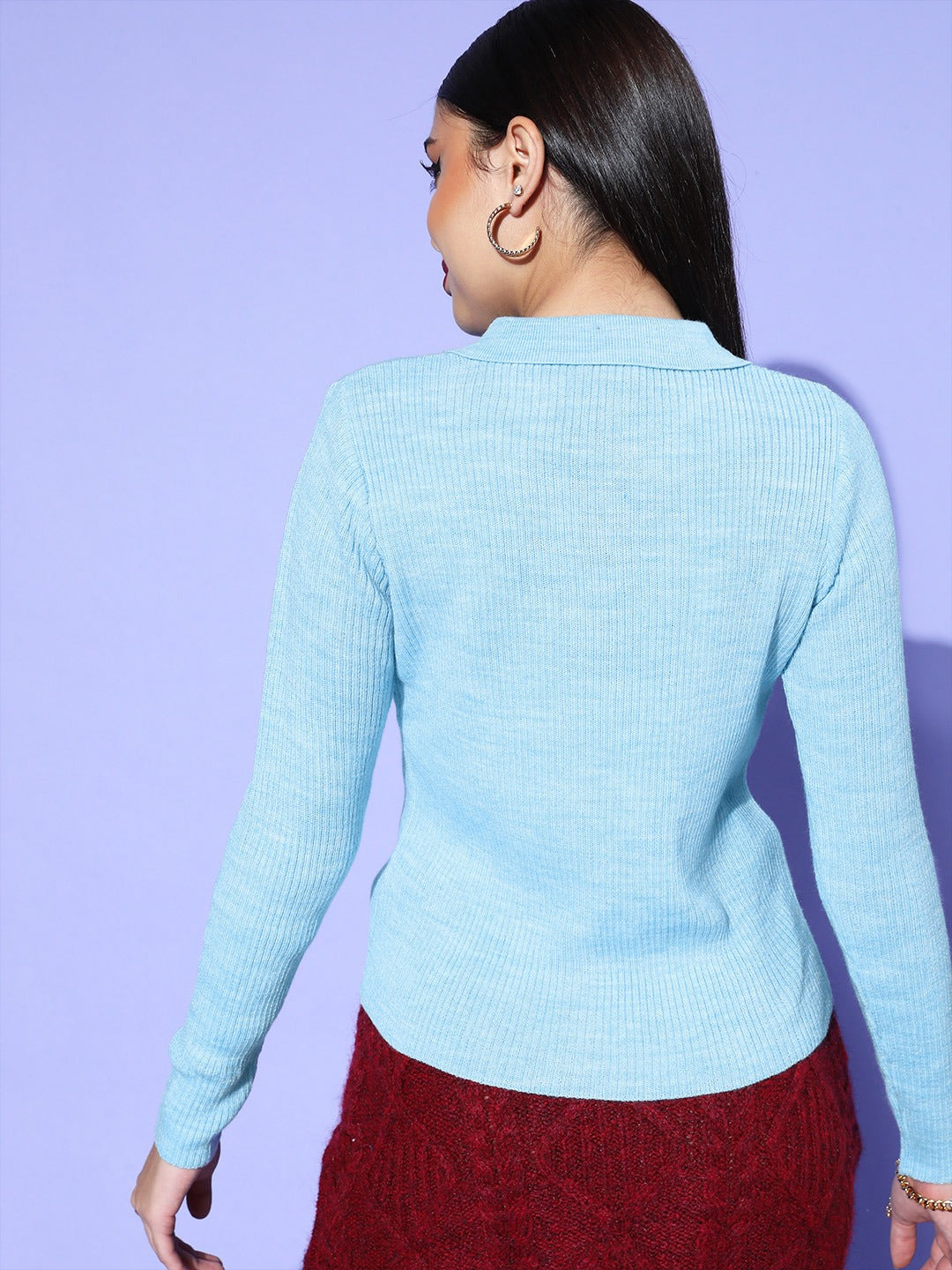Berrylush Women Solid Turquoise Blue V-Neck Acrylic Straight Hem Regular Sweater