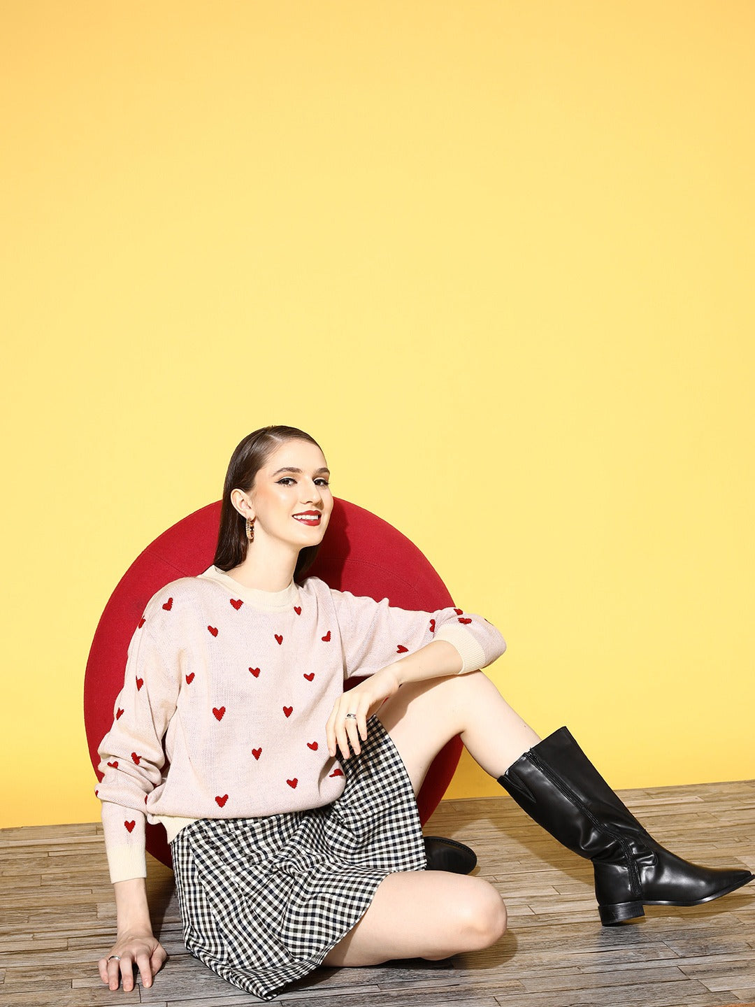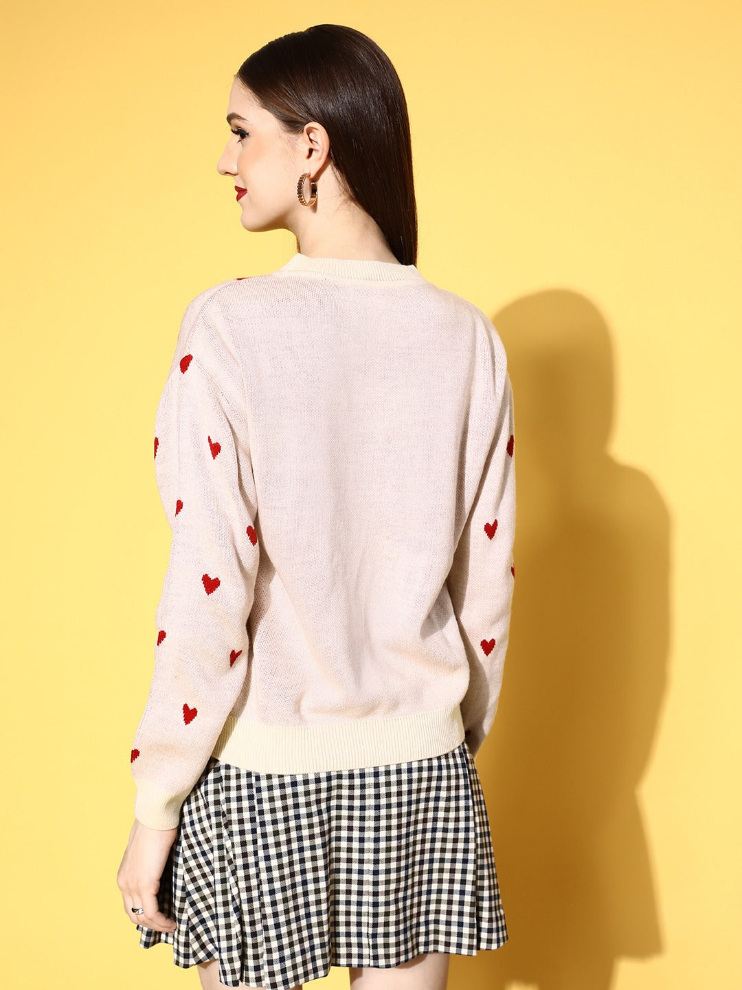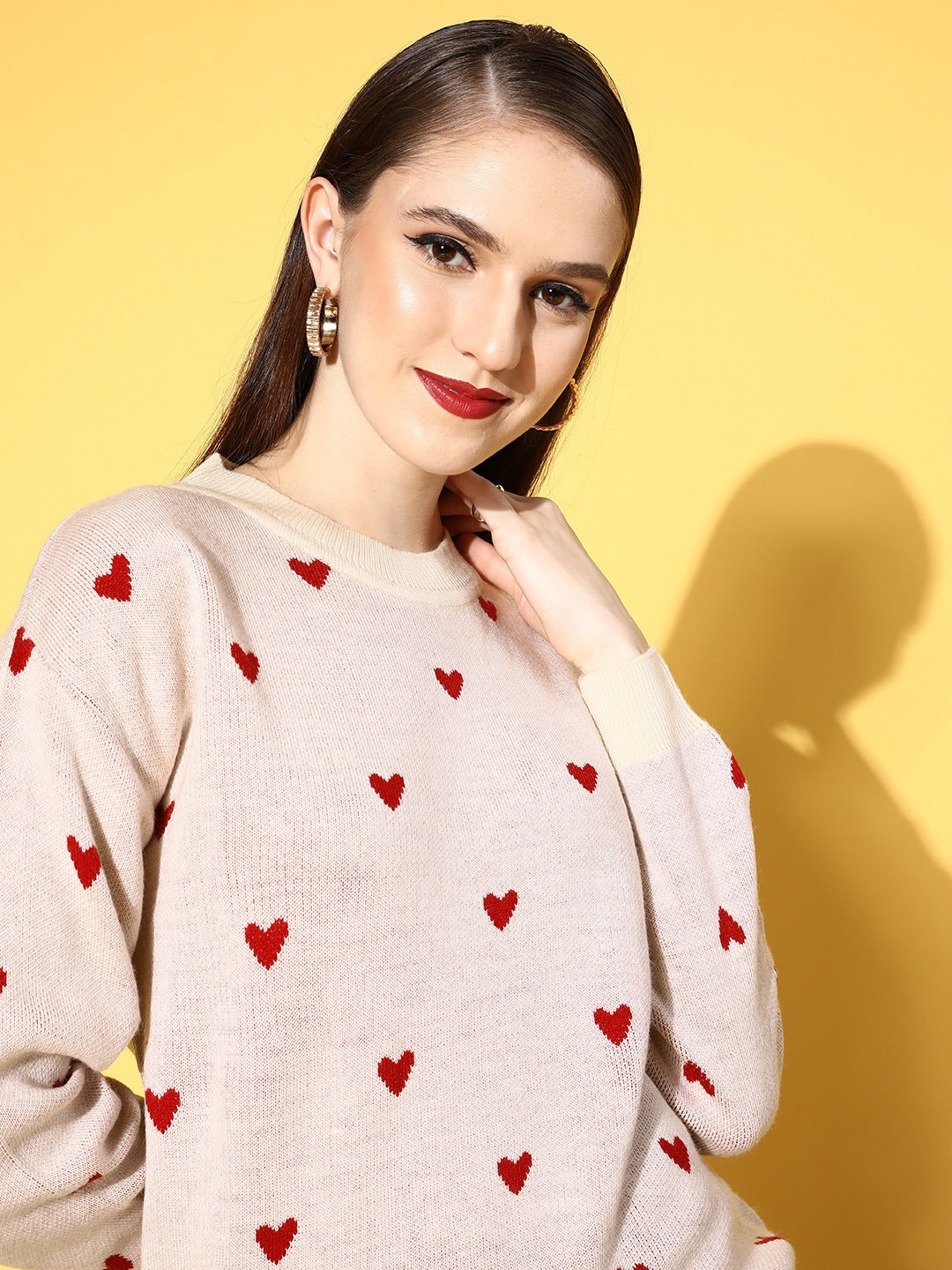 If simple yet sweet is the style you prefer, then it's time to add a touch of pink to your closet with this cute Heart Printed Pullover introduced by Berrylush. Flaunting a beautiful amalgam of pink and red heart print that lends this pullover a captivating design with a cheerful vibe. Elegantly designed with a round neck that gives your neckline a modest and smart appearance. Fashioned with a regular fit that gives this pullover a refined look with a cosy silhouette to keep you comfortable all day long. Wear this pullover over a mini skirt, a pair of ankle-length boots, matching earrings, and a chic side bag for a charismatic look for your picnic date.