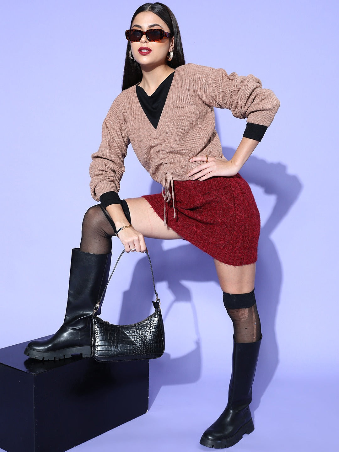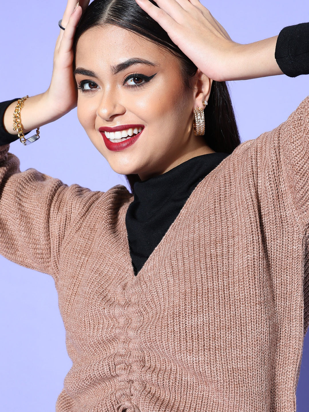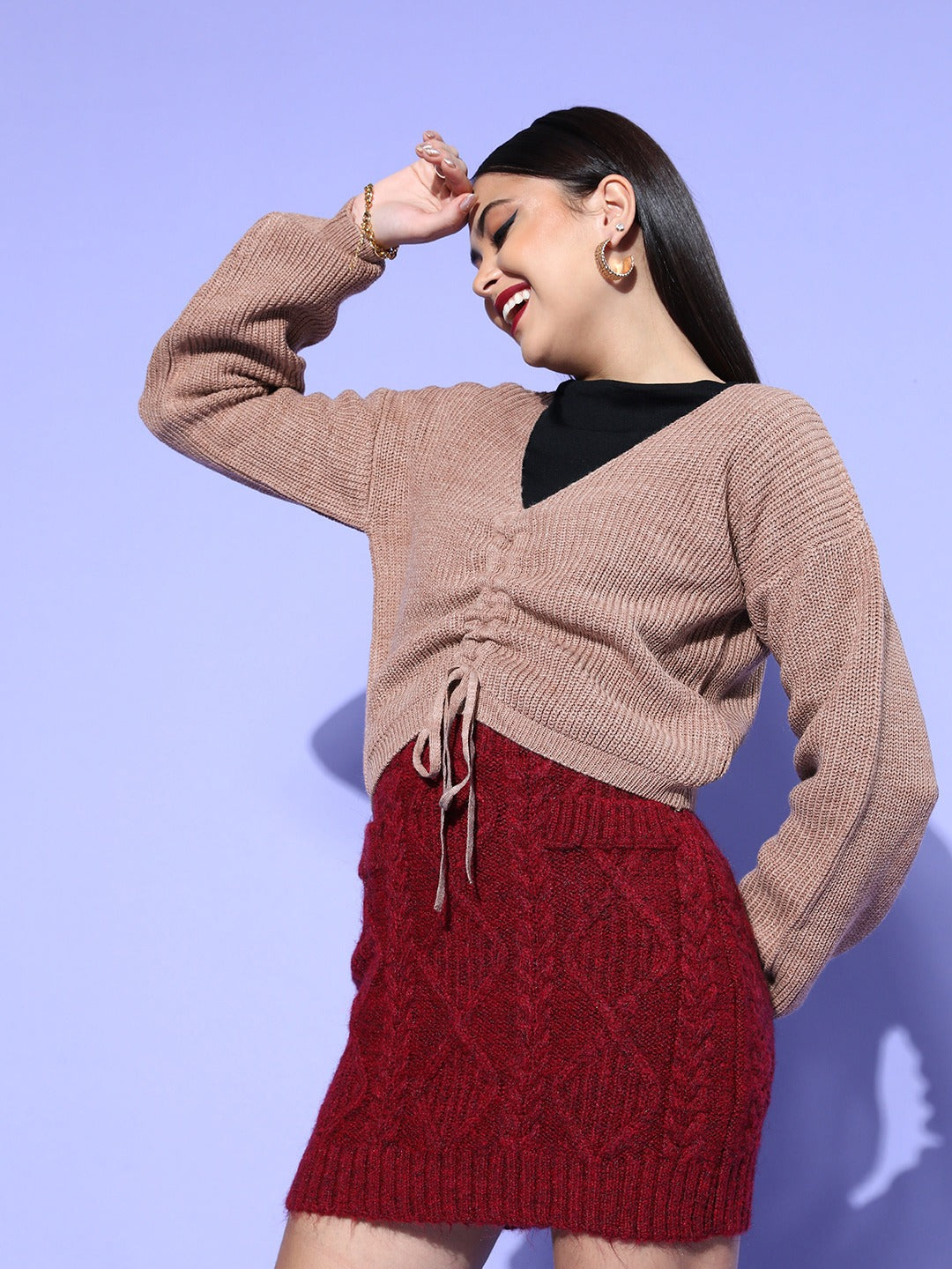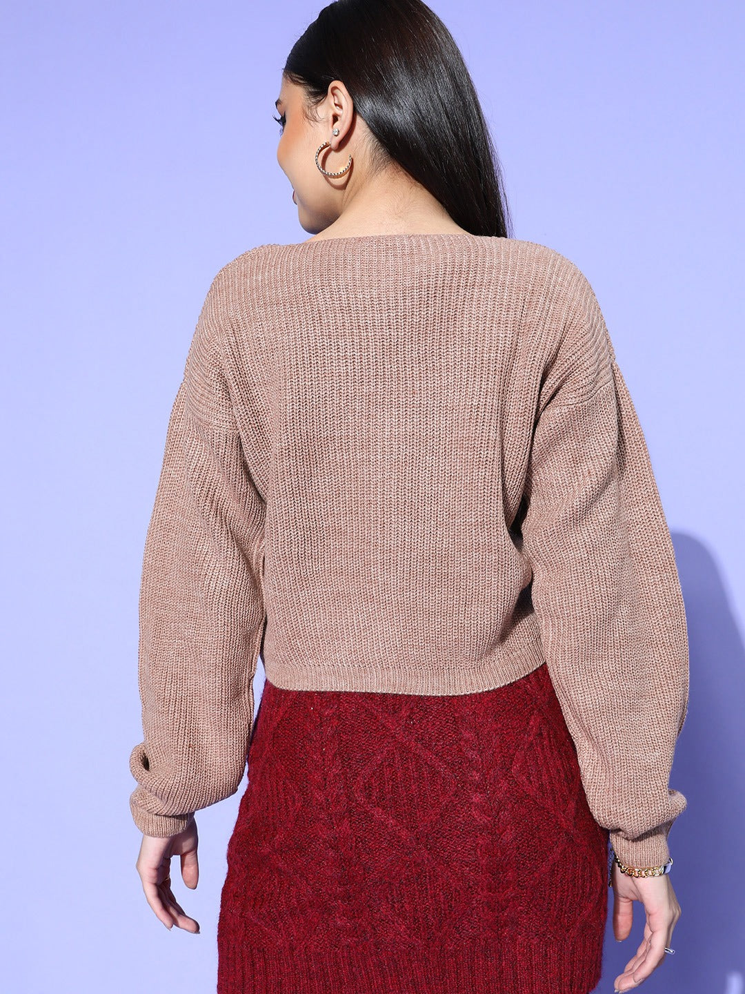 Get a little creative with your winter style by indulging sassy and chic fashion elements just like this pretty Solid Peach V-Neck Straight Crop Pullover Sweater designed by Berrylush. Tailored with a straight hemline that gives this sweater a form-fitting silhouette to elegantly outshine your natural curves along with a snug feel. Fashioned with a V-neck design that lends this sweater a dose of contemporary style with an edgy appeal to your neckline. Moreover, the long-regular sleeves offer your arms proper protection from cold winds with proper coverage. Pair up this sweater with a mini skirt, knee-length boots, diamond hoop earrings, and a cute black handbag to get a fabulous look for your night-out plan.