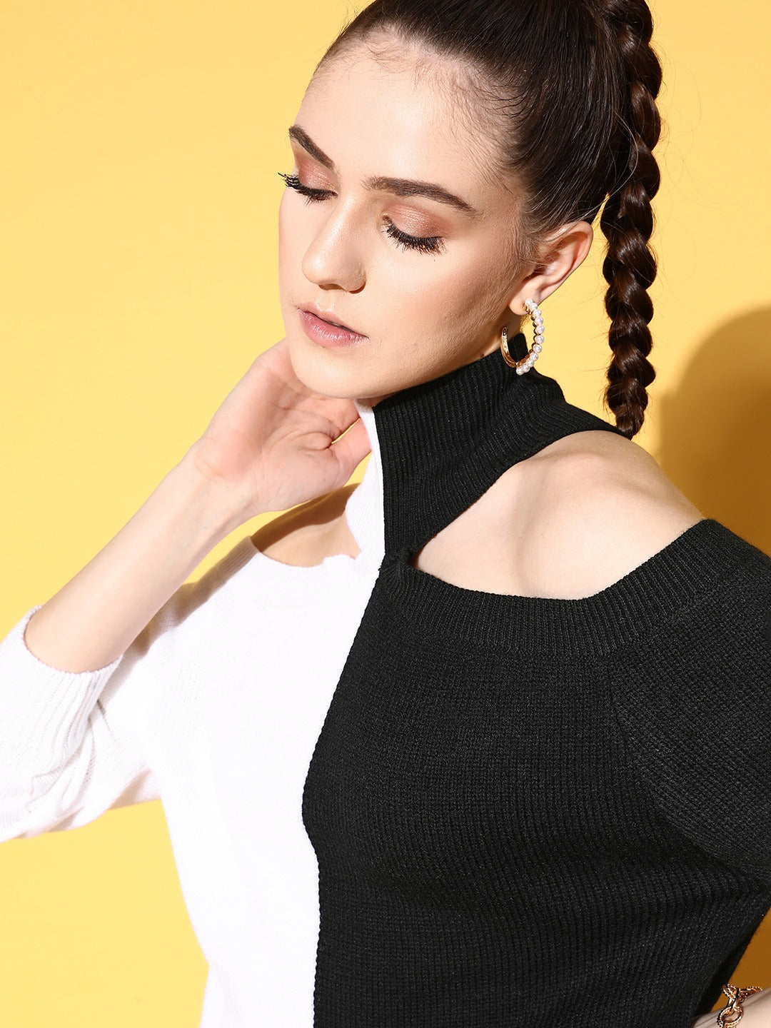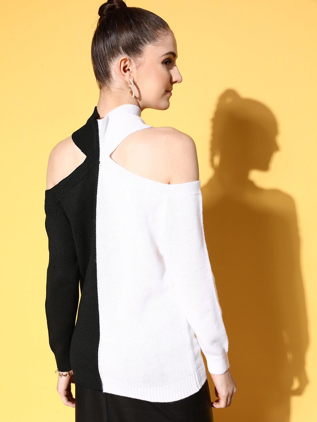 Berrylush Women Colourblocked Black & White Turtle Neck Shoulder Cutout Knitted Acrylic Pullover