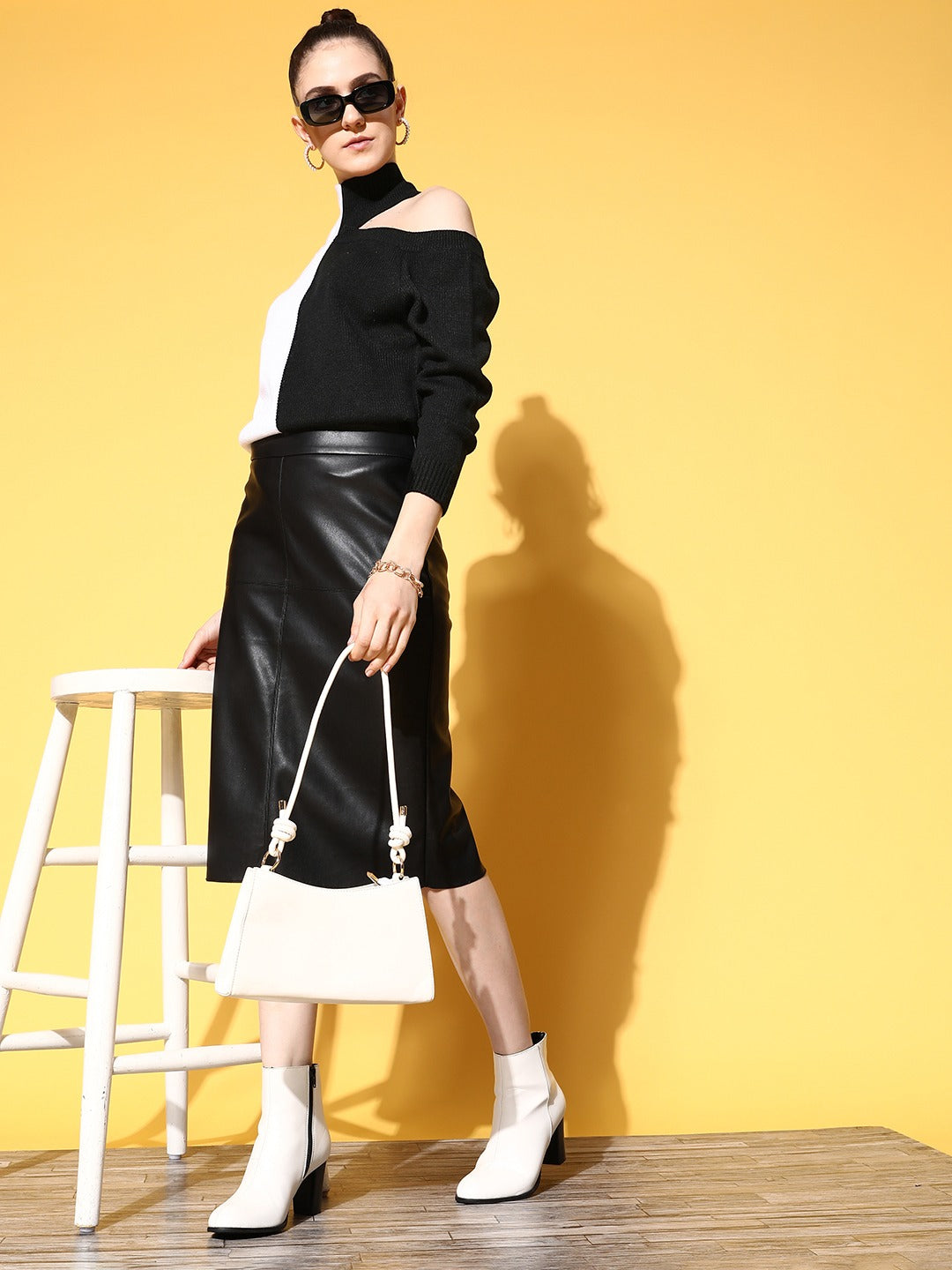 Keep your winter style game trendy with a monochromatic theme by investing in this Colourblocked Black & White Turtle Neck Shoulder Cutout Knitted Acrylic Pullover from Berrylush. The amazing mixture of black and white shades presents a majestic colour block design that makes your casual look appear chic and eye-catching. Tailored from the finest acrylic fabric that offers resistance to fading and sunlight helps to keep the brand-new look of this pullover. The pullover design enables this top to keep you warm and cosy all day long by restricting the flow of cold wind. You can complete your winter outing look by teaming up this cute pullover with a black leather midi skirt, a pair of white ankle boots, diamond earrings, and a white side bag.