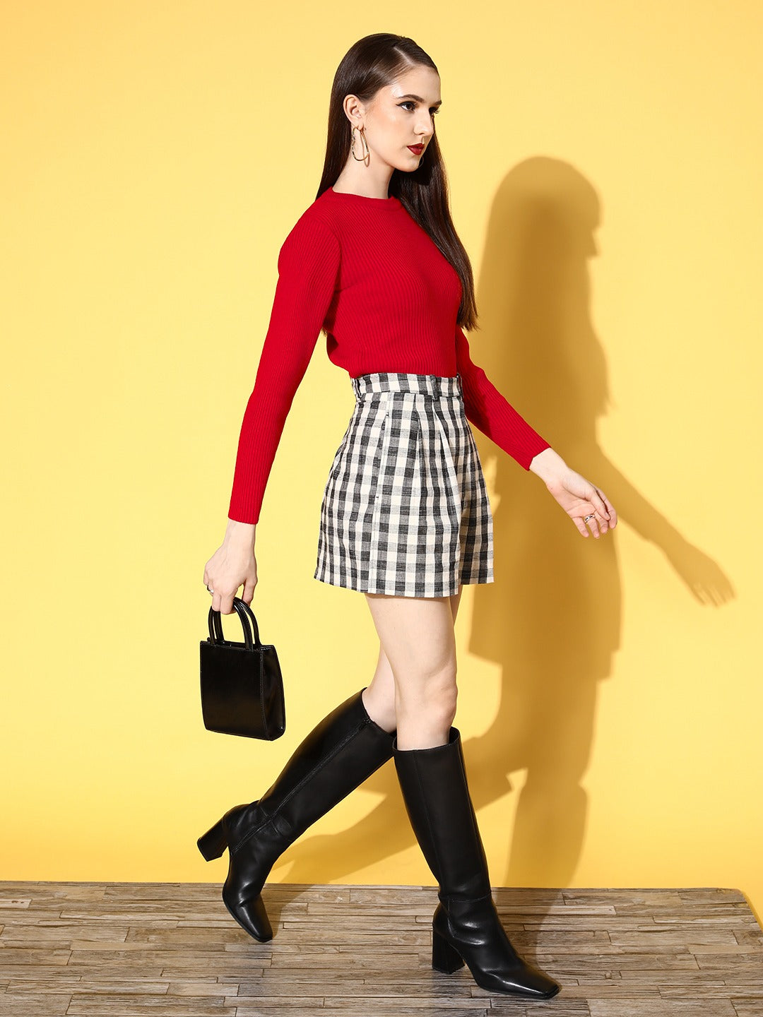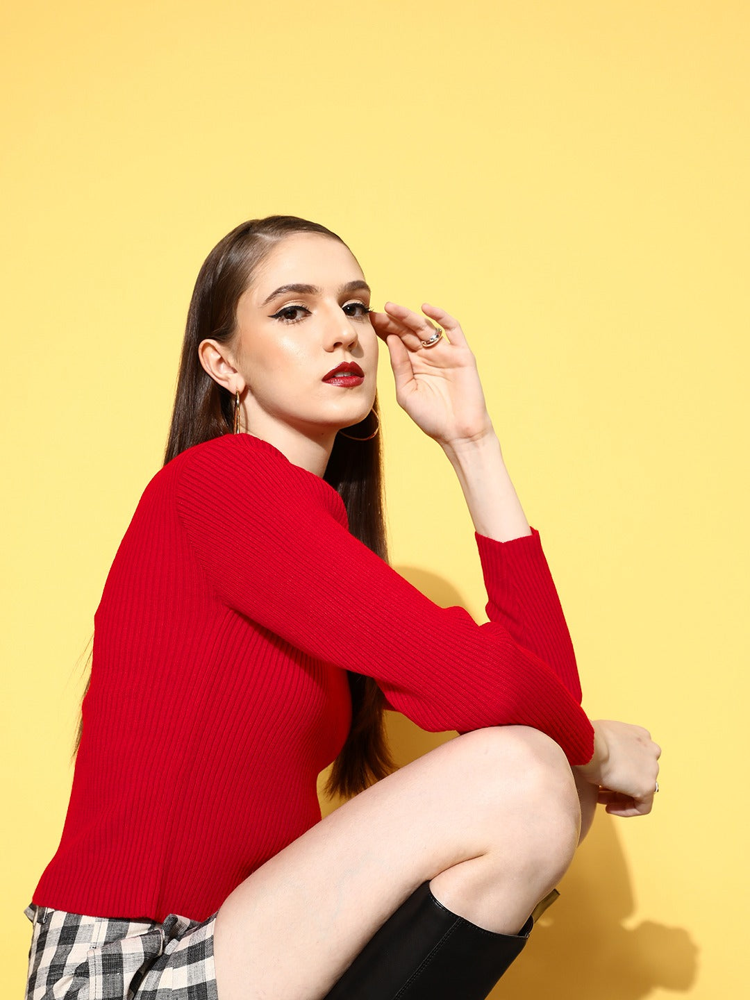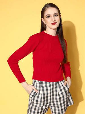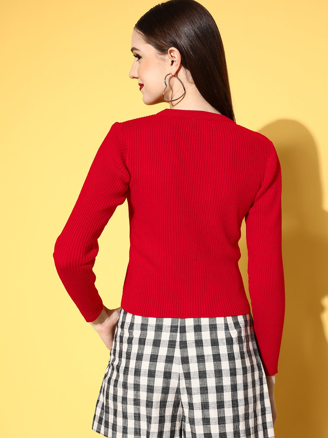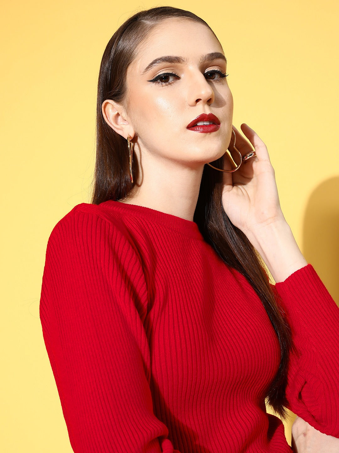 Berrylush Women Solid Red Round Neck Acrylic Ribbed Hem Pullover Sweater