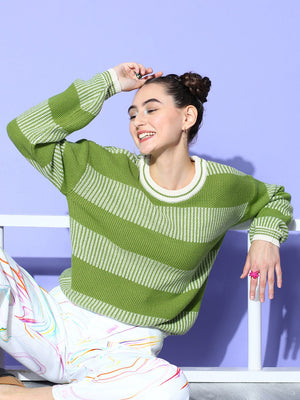 Berrylush Women Green & White Striped Pattern Round Neck Acrylic Ribbed Hem Pullover