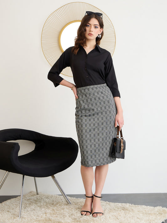 Berrylush BIZwear Women Black & White Checked Print High-Rise Waist Slip-On Straight Hem Knitted Pencil Midi Skirt