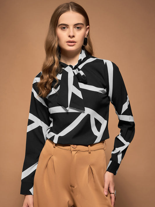 Berrylush BIZwear Women Black & White Geometric Printed Tie-Up Neck Long Sleeves Regular Top
