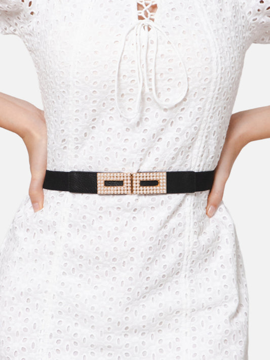 Berrylush Women Black Elastic Strap Diamonte Double Buckle Belt