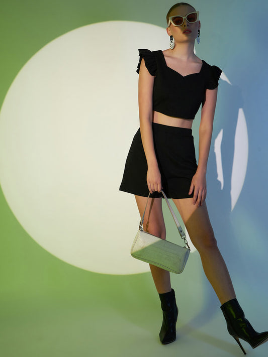 Berrylush Women Solid Black Sweetheart Neck Sleeveless Ruffled Crop Top & High-Rise Mini Shorts Co-Ord Set