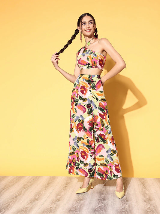 Berrylush Women Pink Abstract Printed One-Shoulder Neck Thigh-High Slit Maxi Co-Ordinate Set