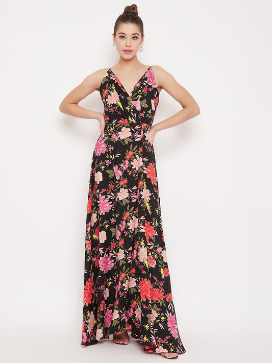 Berrylush Women Pink & Blue Floral Printed V-Neck Flared Maxi Dress