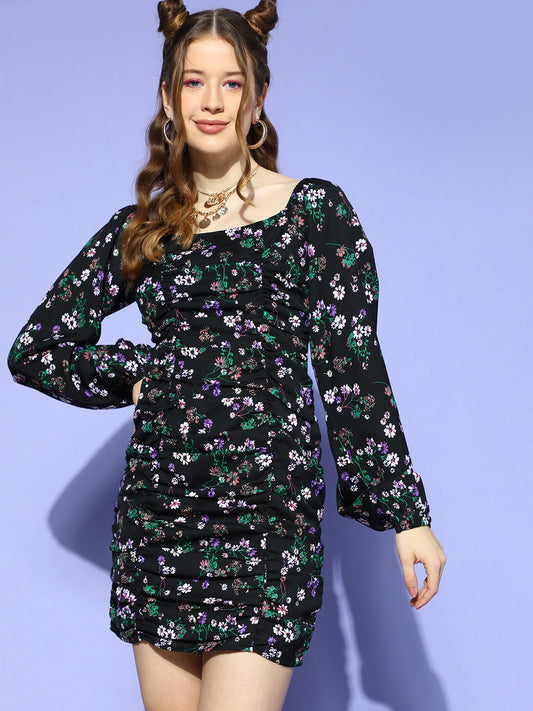 Berrylush Women Black & White Floral Printed Square Neck Tie-Up Straps Crepe Straight Hem Empire Mini Dress