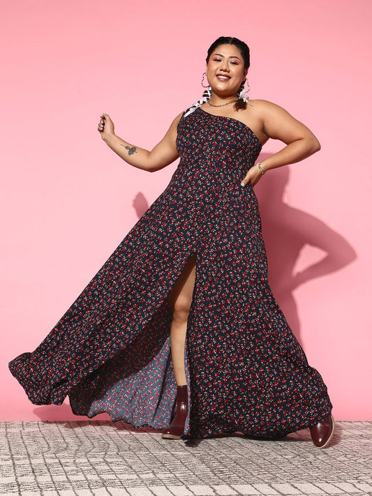 Berrylush Curve Women Navy Blue & White Floral Printed V-Neck Sleeveless Flounce Hem Ruffled A-Line Midi Dress