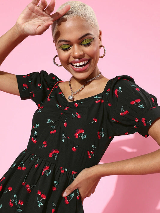 Berrylush Women White & Red Floral Printed Square Neck Puff Sleeves Back Tie-Up Layered Fit & Flare Mini Dress