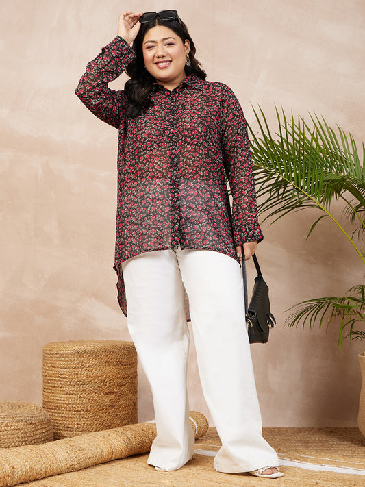 Berrylush Women Plus Size Black & Red Floral Printed Collar Neck Button-Up Georgette High-Low Hem Longline Shirt