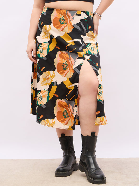 Berrylush Curve Women Black, Purple, & Green Floral Printed High-Rise Waist Thigh-High Slit Straight Hem A-Line Maxi Skirt