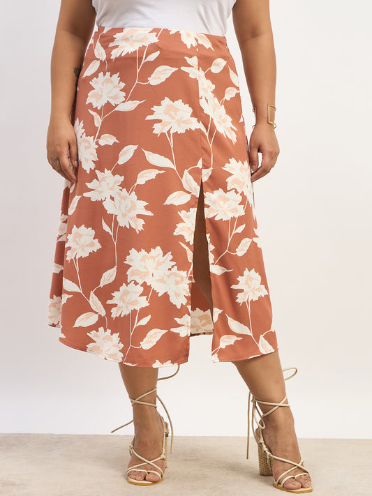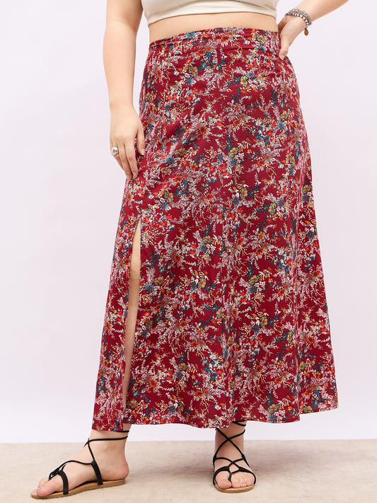 Berrylush Curve Women Red Floral Print High-Rise Side Slit Flared A-Line Maxi Skirt