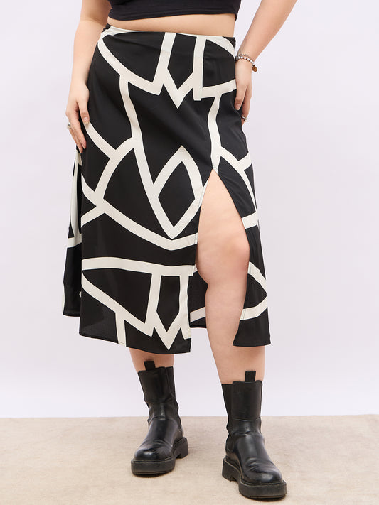 Berrylush Curve Women Black & White Abstract Printed High-Rise Waist Thigh-High Slit Flared A-line Maxi Skirt