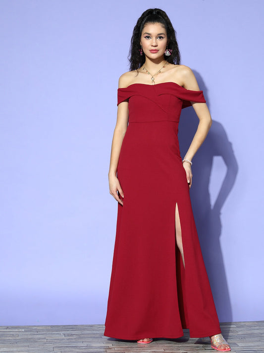Berrylush Women Plus Size Solid Maroon Off-Shoulder Neck Cold-Shoulder Sleeve Thigh-High Slit Flared Maxi Dress