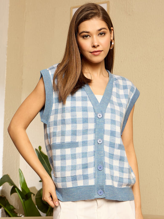 Berrylush Women Grey & Black Check Printed Round Neck Acrylic Straight Hem Pullover