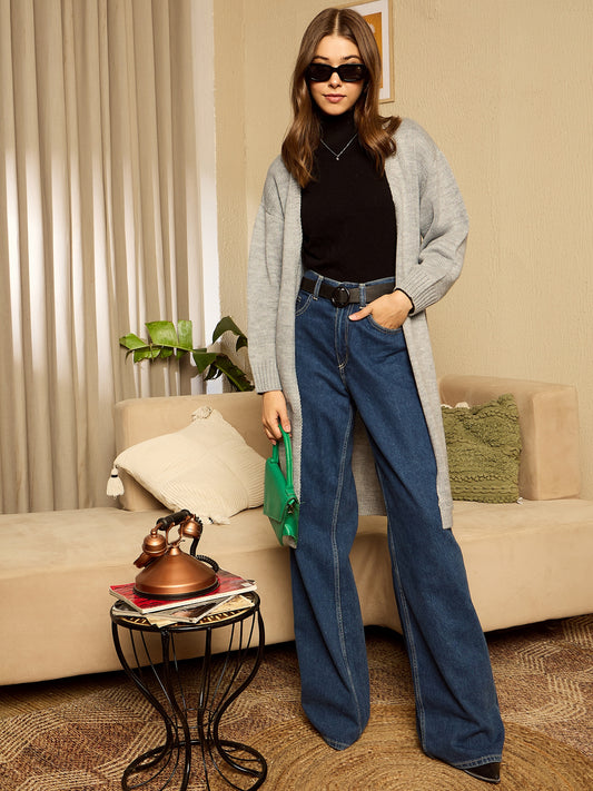 Berrylush Women Black & Grey Self-Design Pattern Shawl Collar Neck Lantern Sleeve Tweed Tailored Regular Coat
