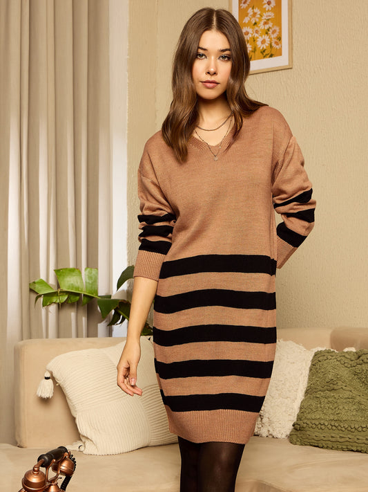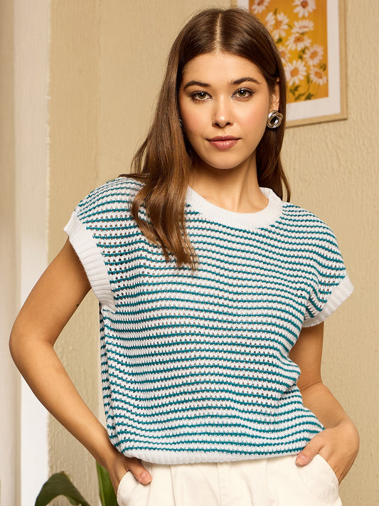 Berrylush Women Green & White Striped Pattern Round Neck Drop-Shoulder Sleeves Acrylic Ribbed Hem Regular Sweater