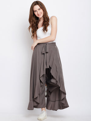 Berrylush Women Solid Grey Waist Tie-Up Ruffled Maxi Skirt with Attached Trousers