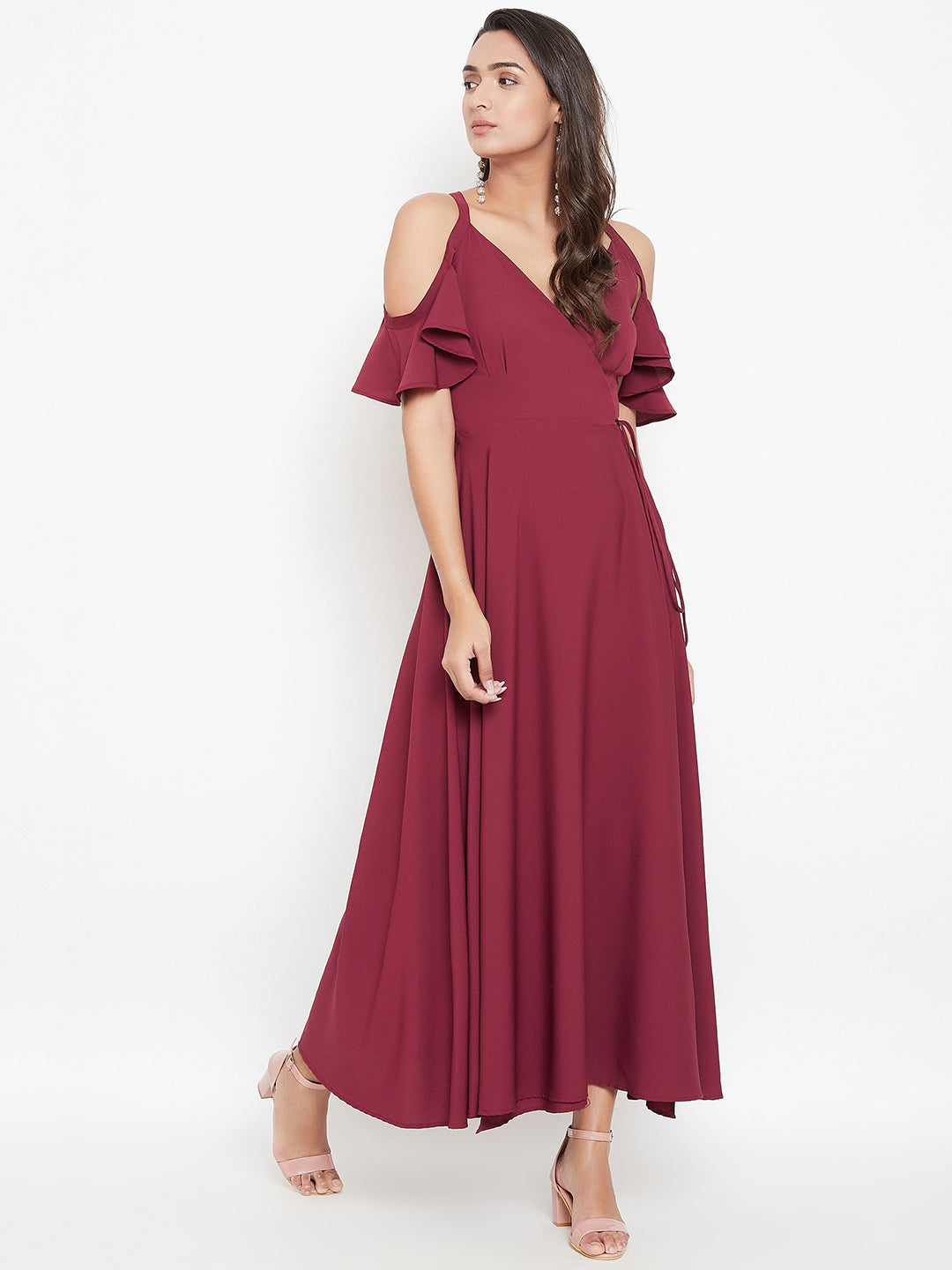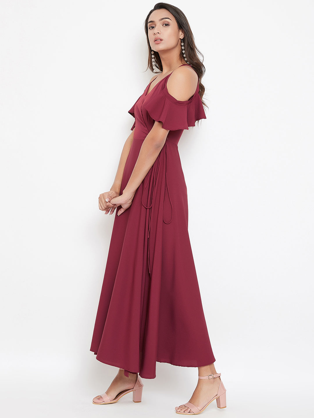 Berrylush Women Solid Maroon V-Neck Cold-Shoulder Maxi Dress