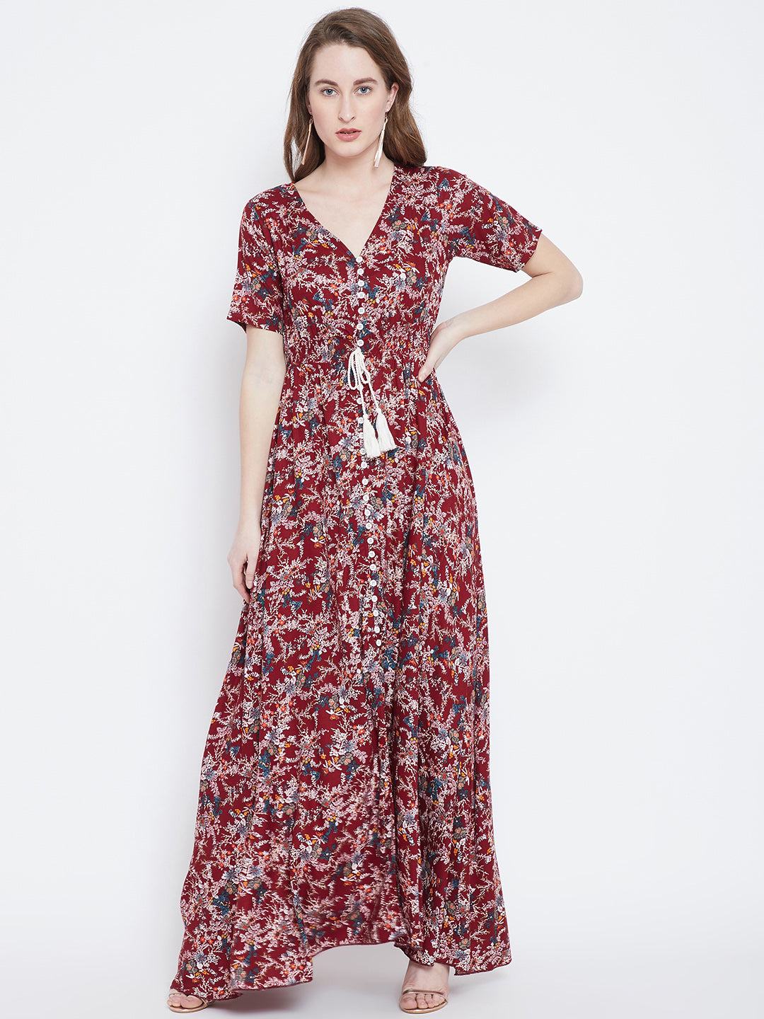 Berrylush Women Maroon & White Floral Printed V-Neck Thigh-High Slit Smocked Maxi Dress