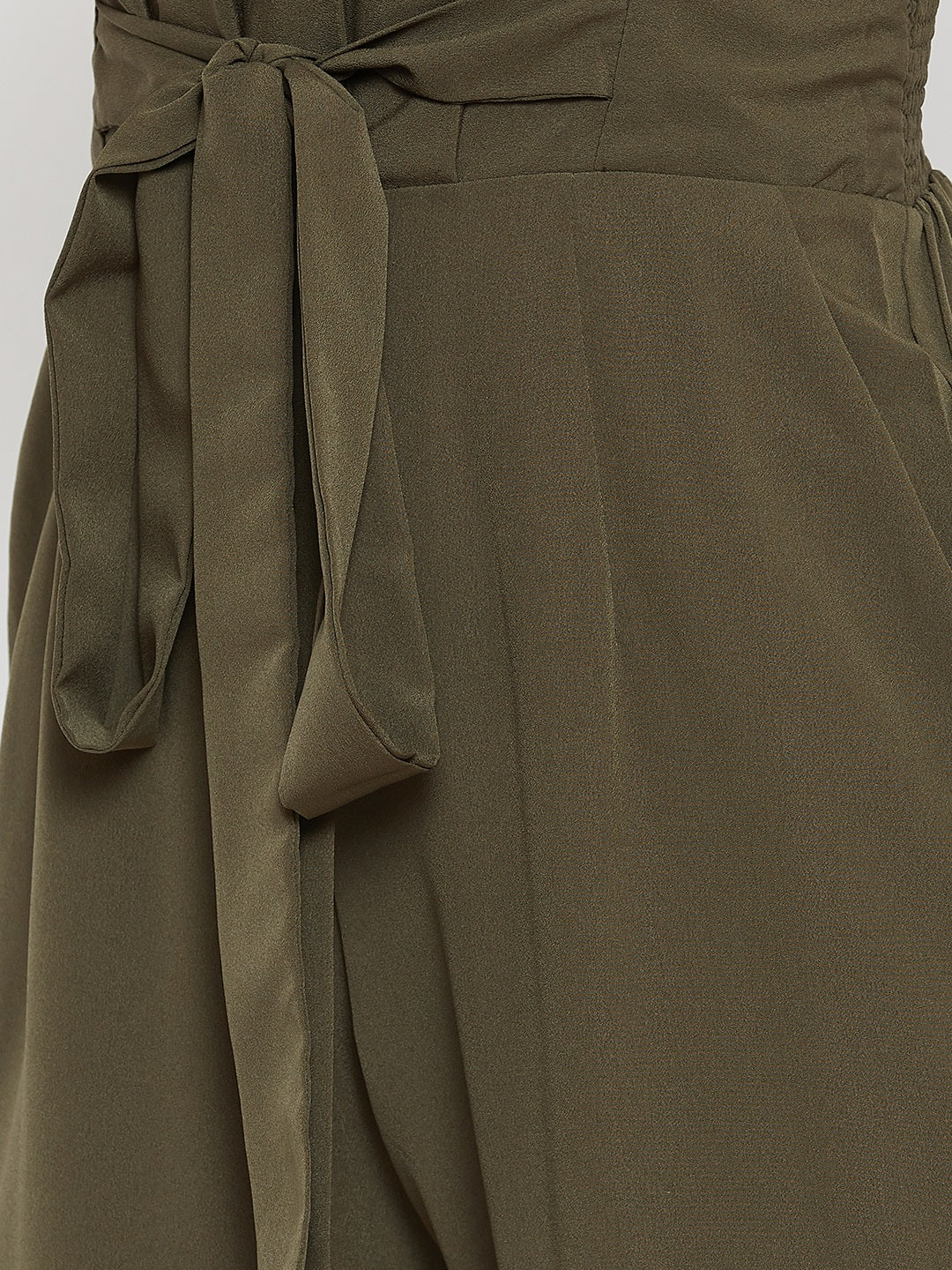 Berrylush Women Solid Olive Green Smocked Back Tie-Up Capri Jumpsuit