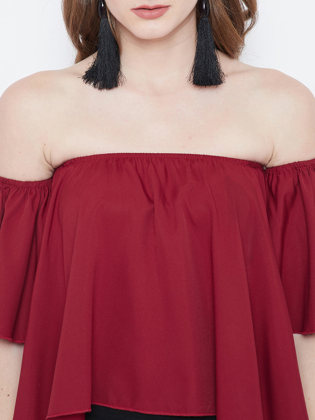 Berrylush Women Solid Red Off-Shoulder Neck Ruffled Crop Bardot Top