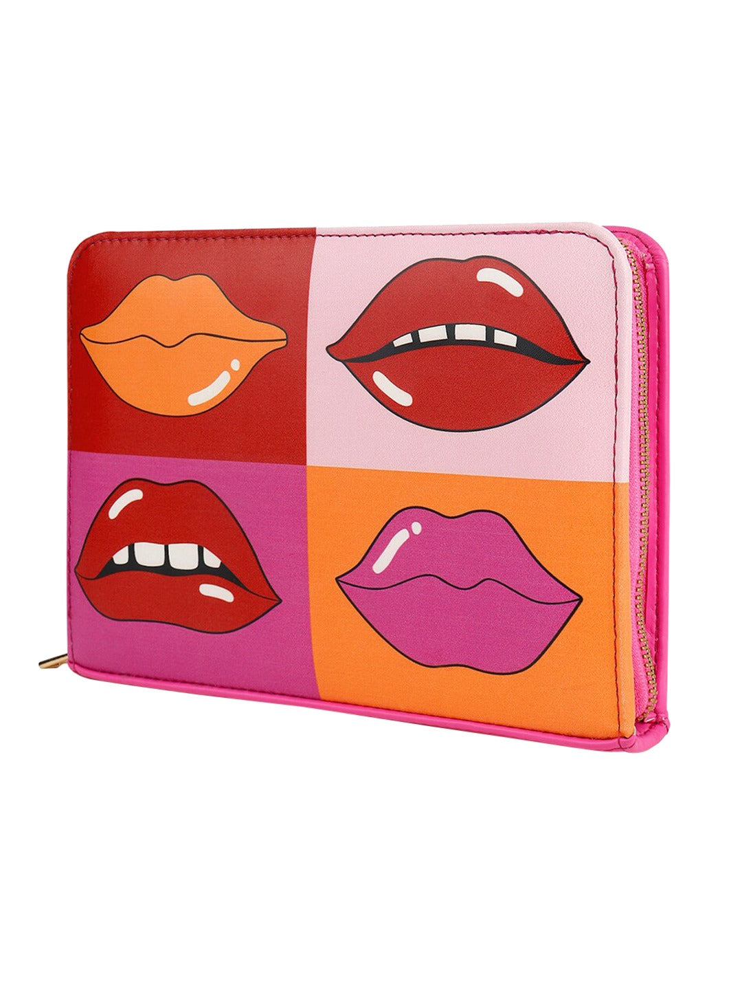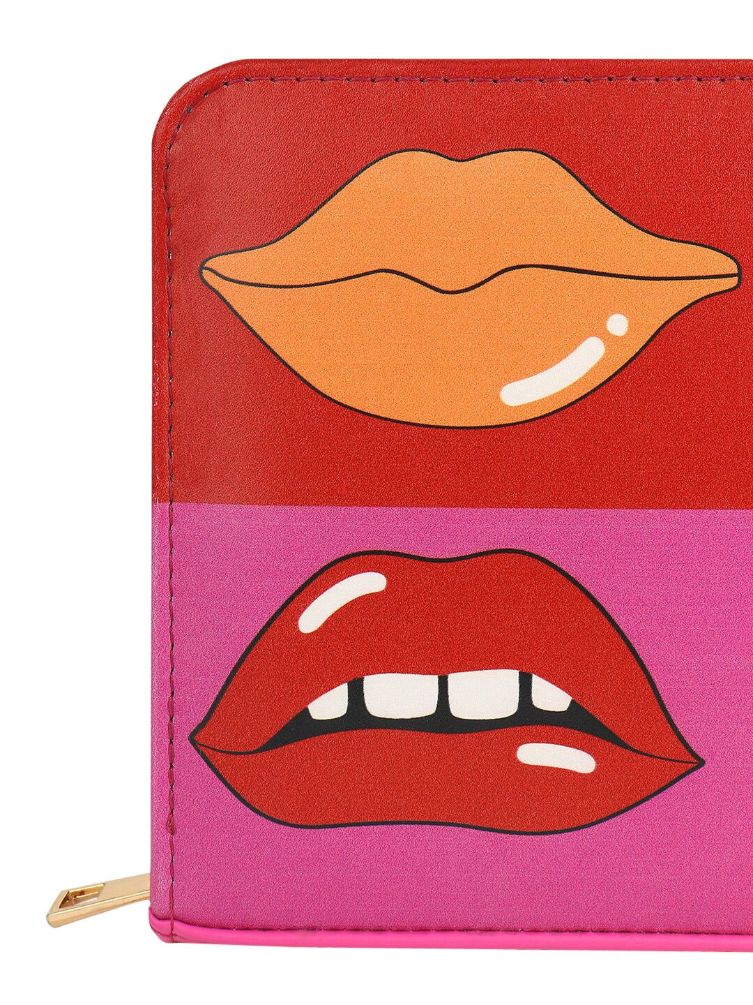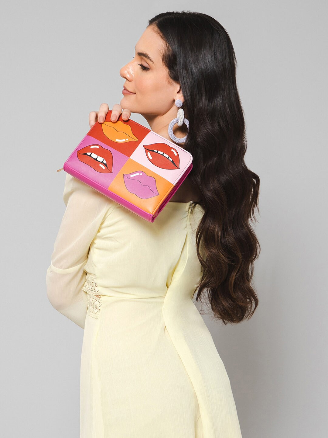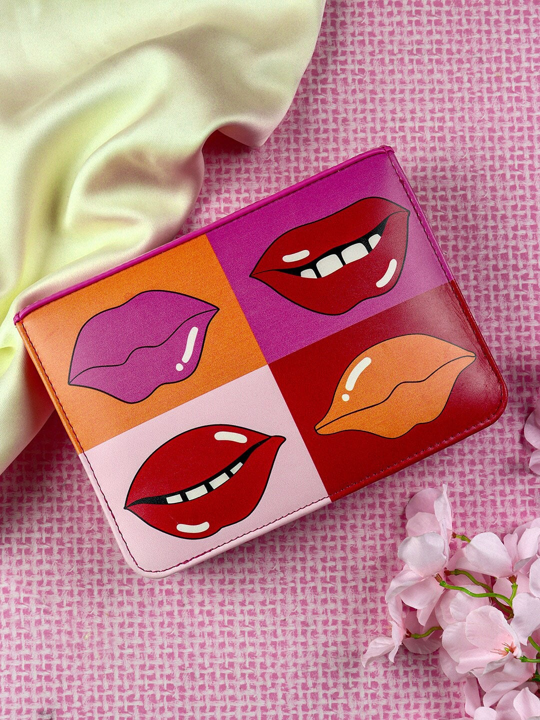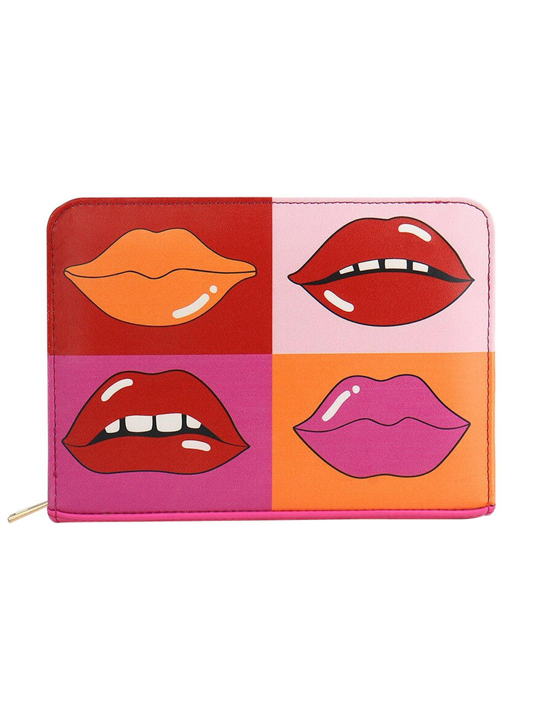 Berrylush Women Pink & Multicolour Lips Graphic Printed PU Zipper-Up Purse Clutch