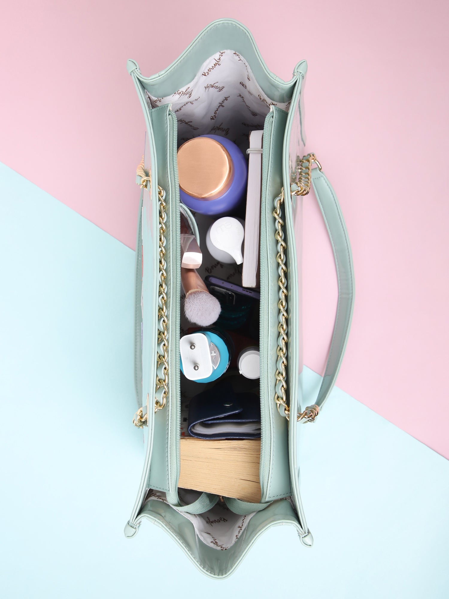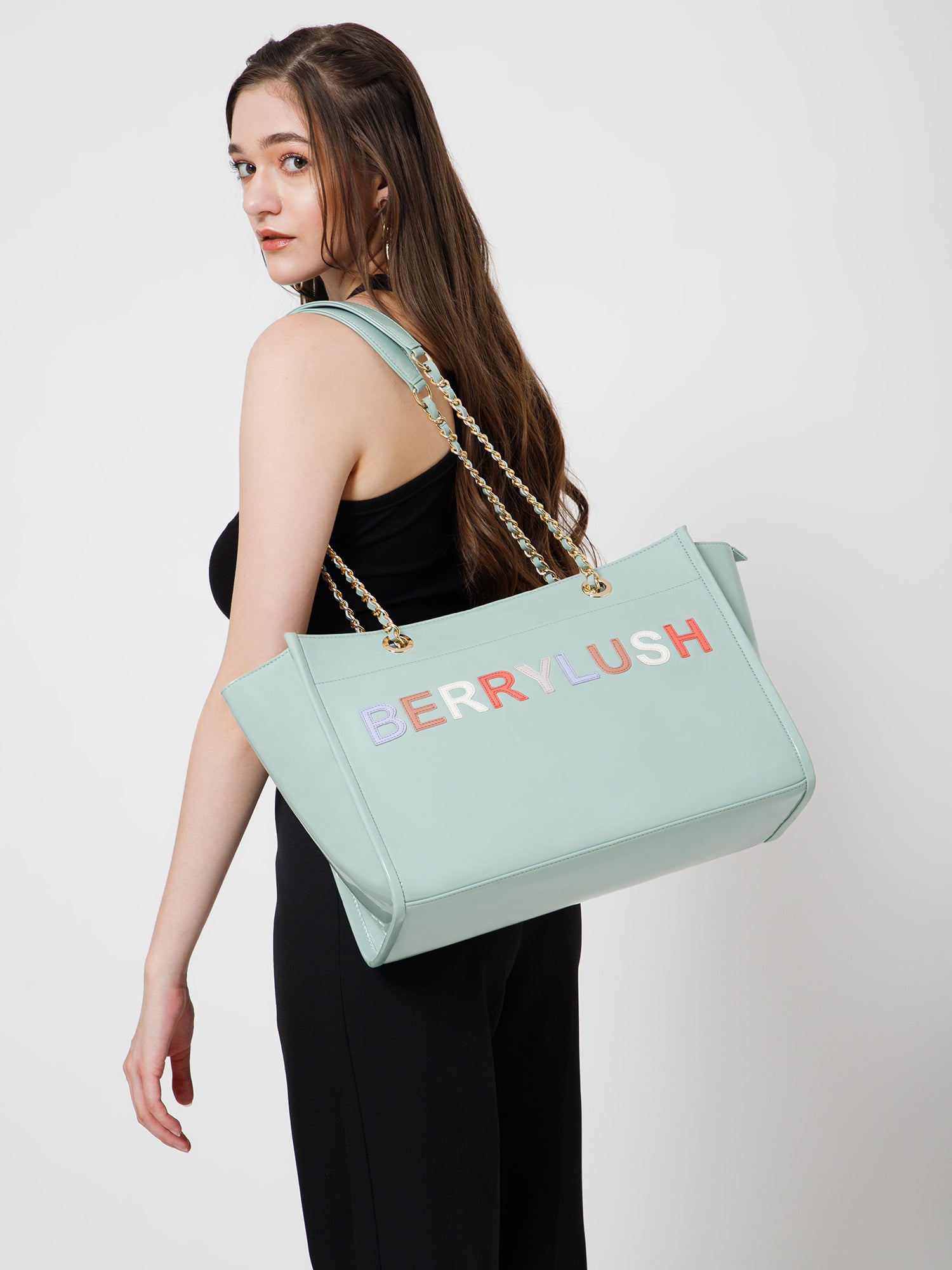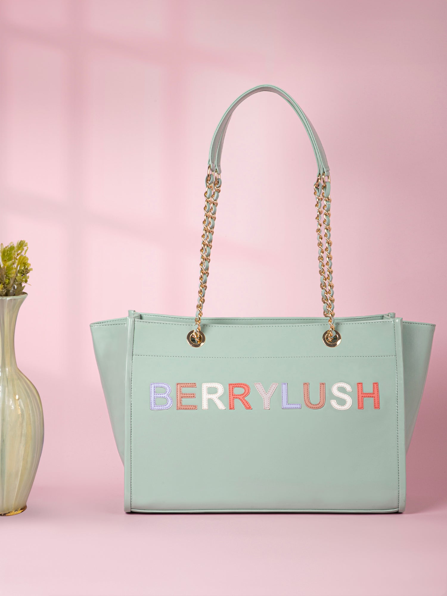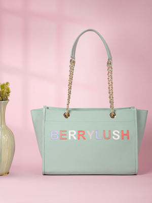 Berrylush Women Green Typography PU Mobile Pouch Embellished Oversized Tote Bag