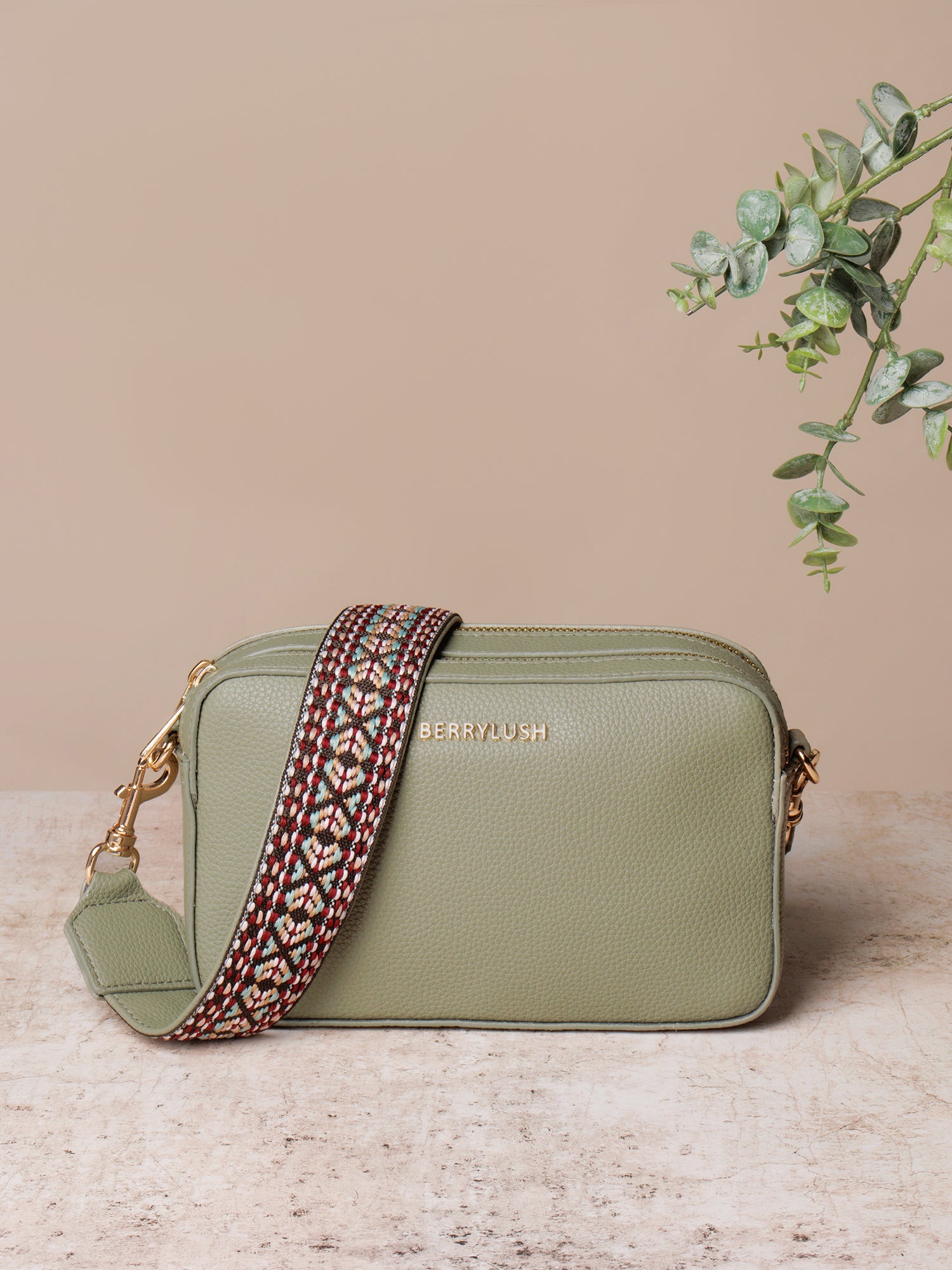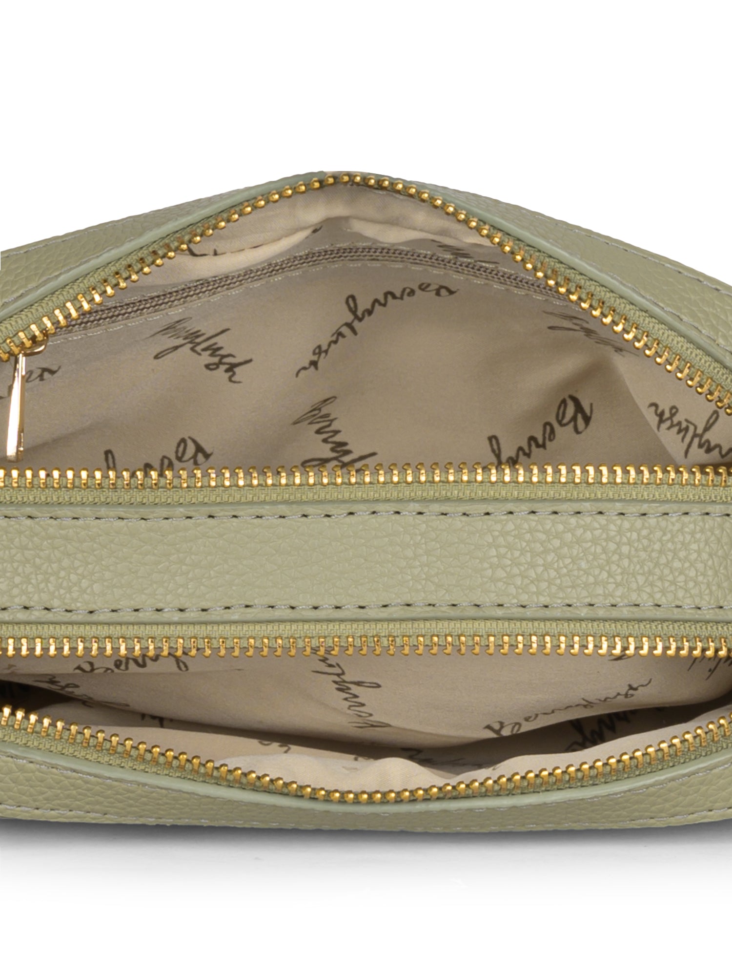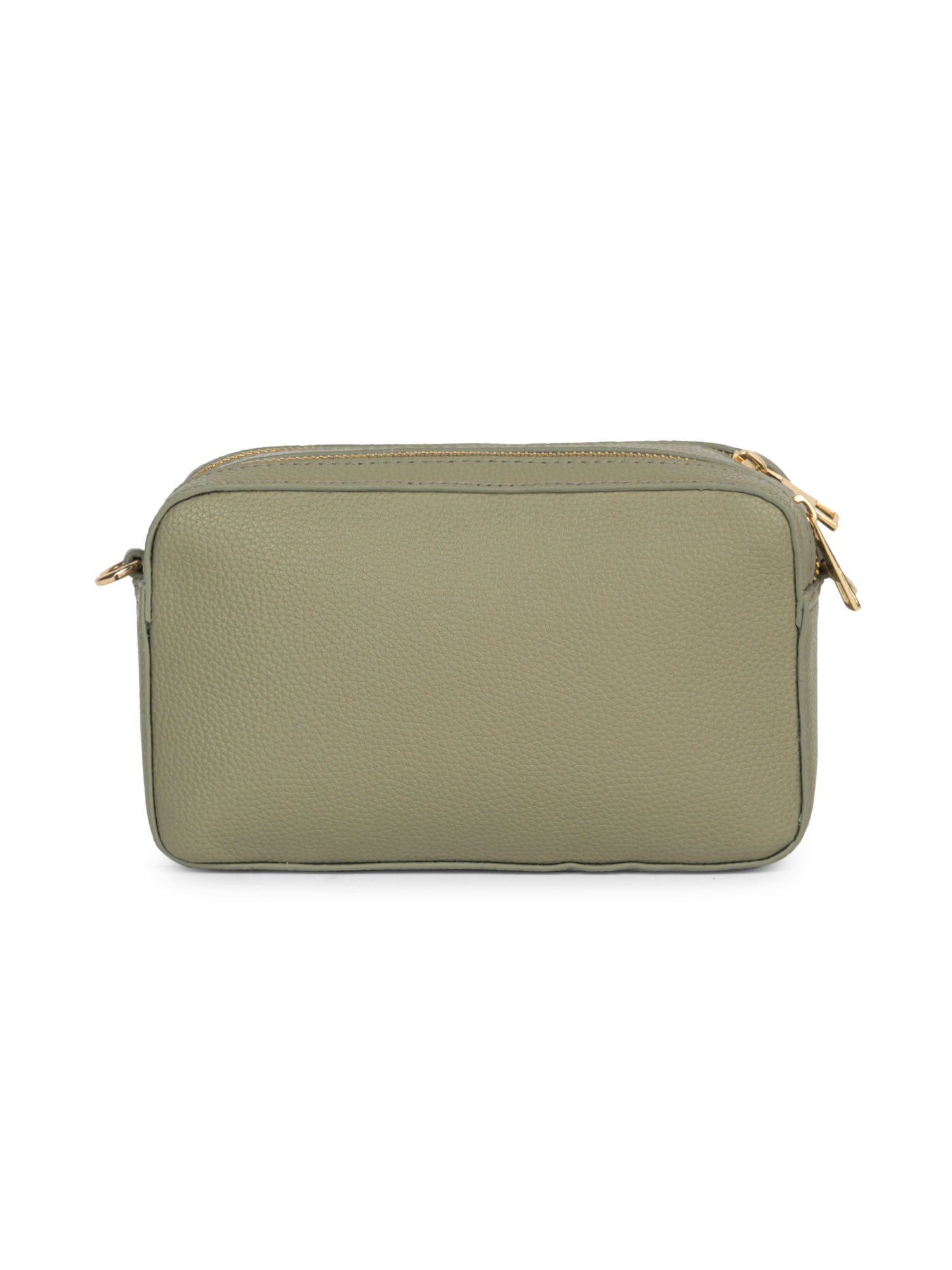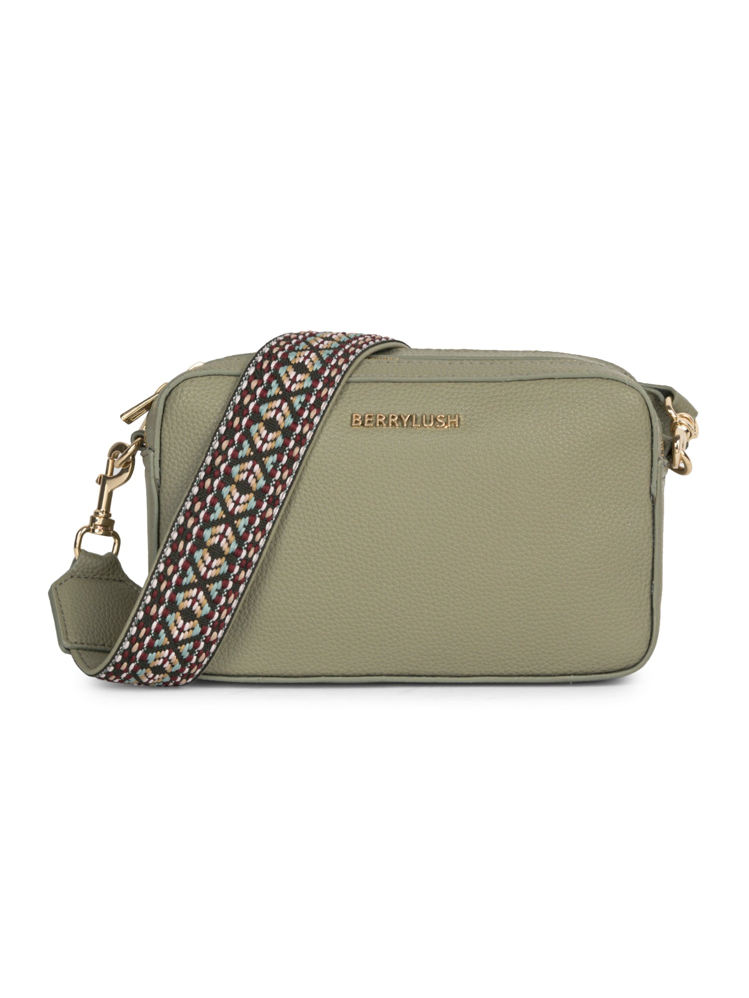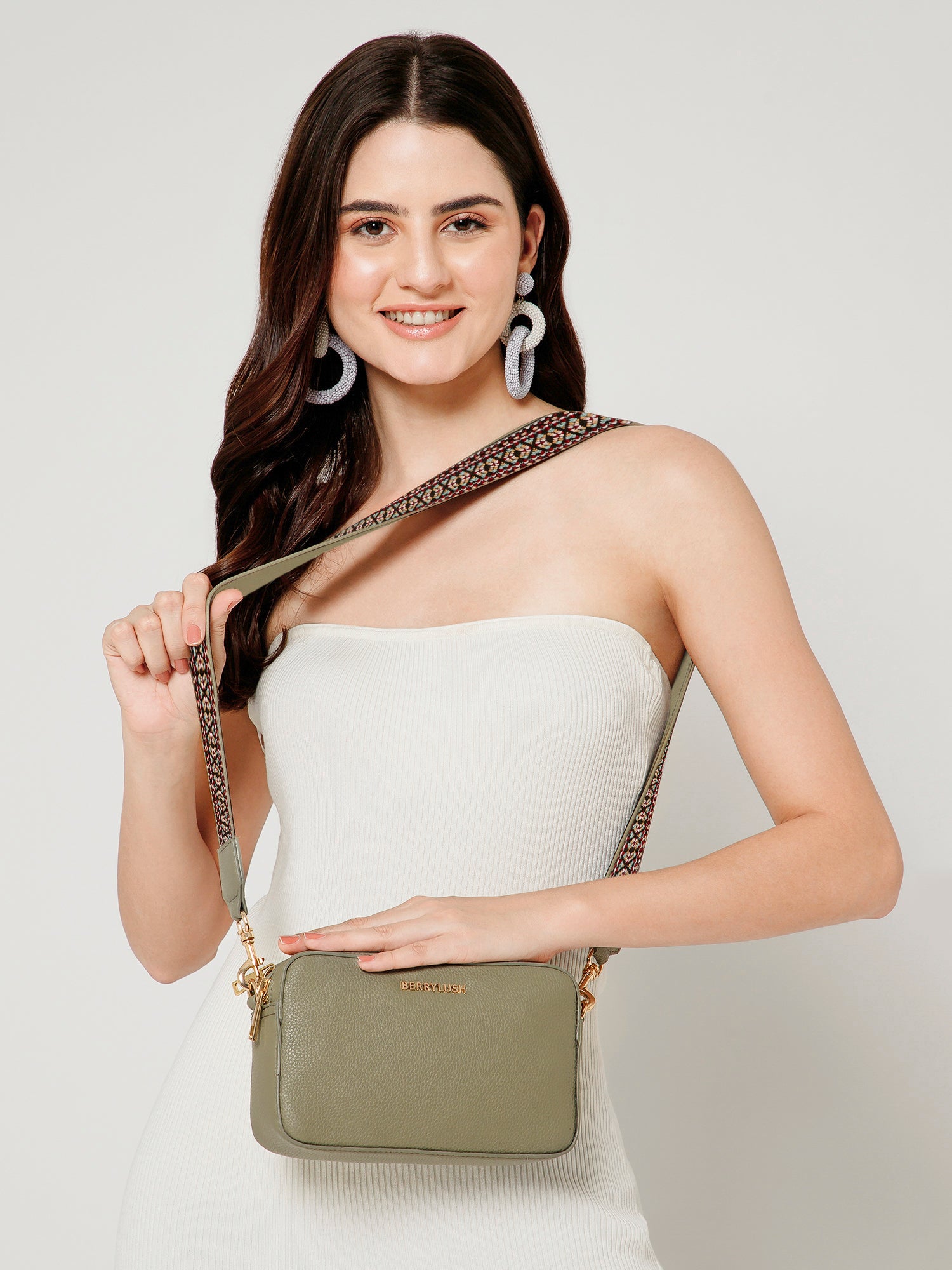 Berrylush Women Green Textured Pattern Synthetic Leather Detachable Strap Logo Embellished Sling Bag