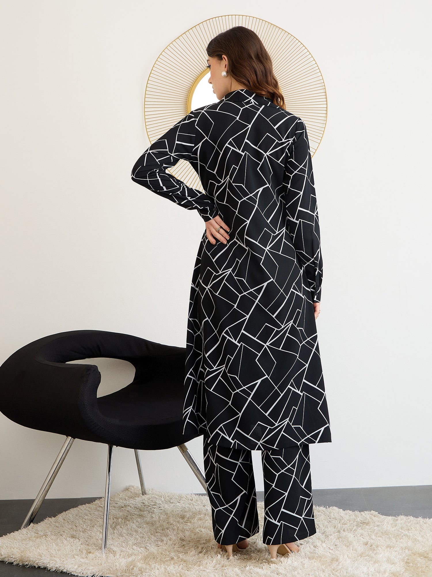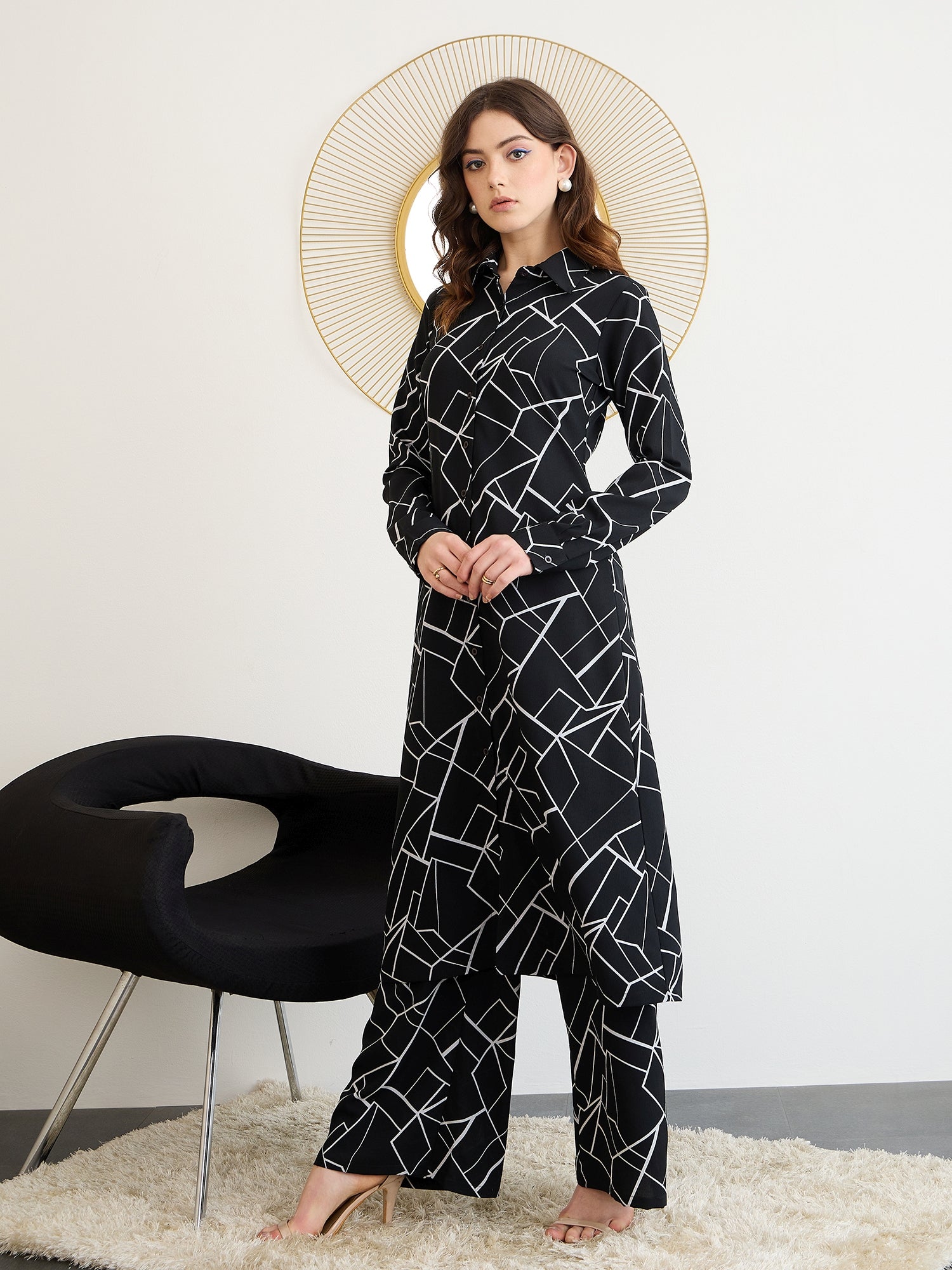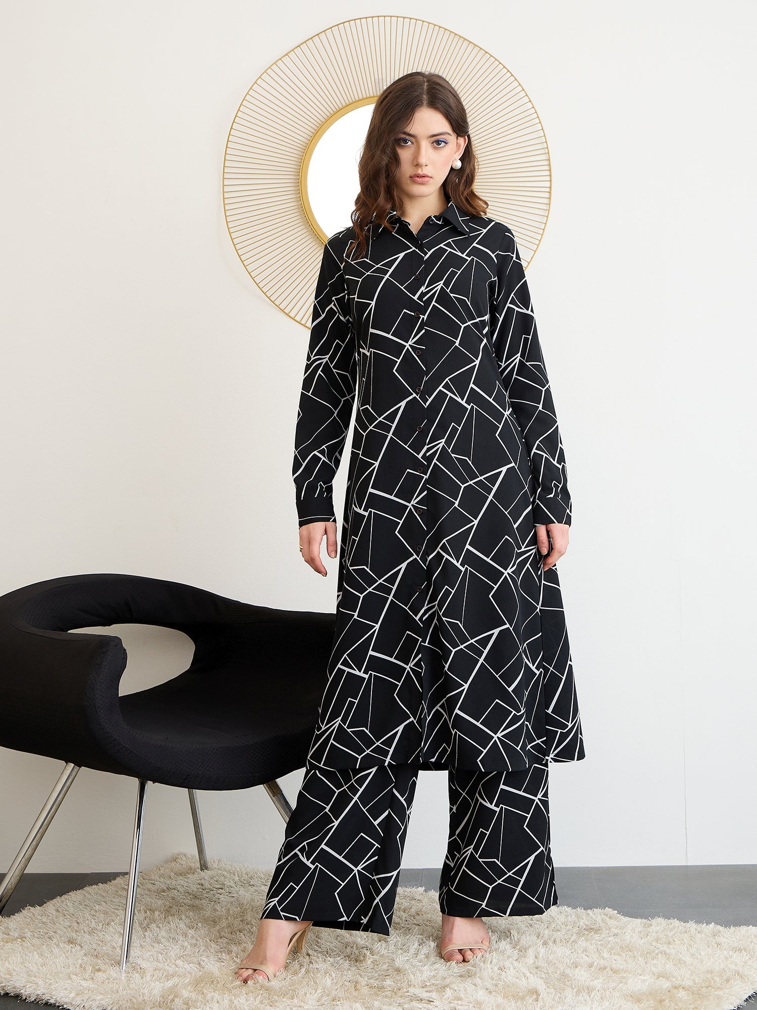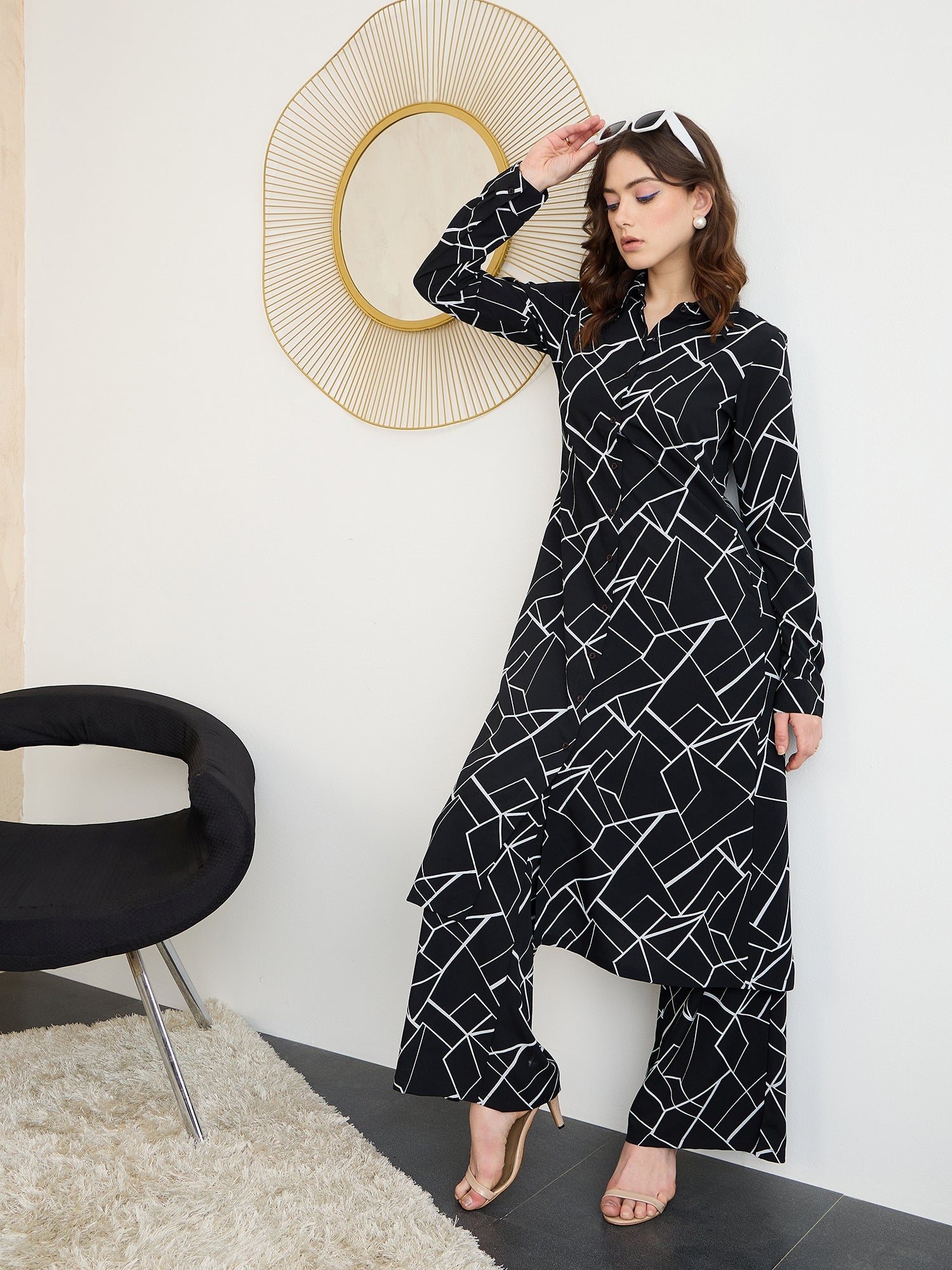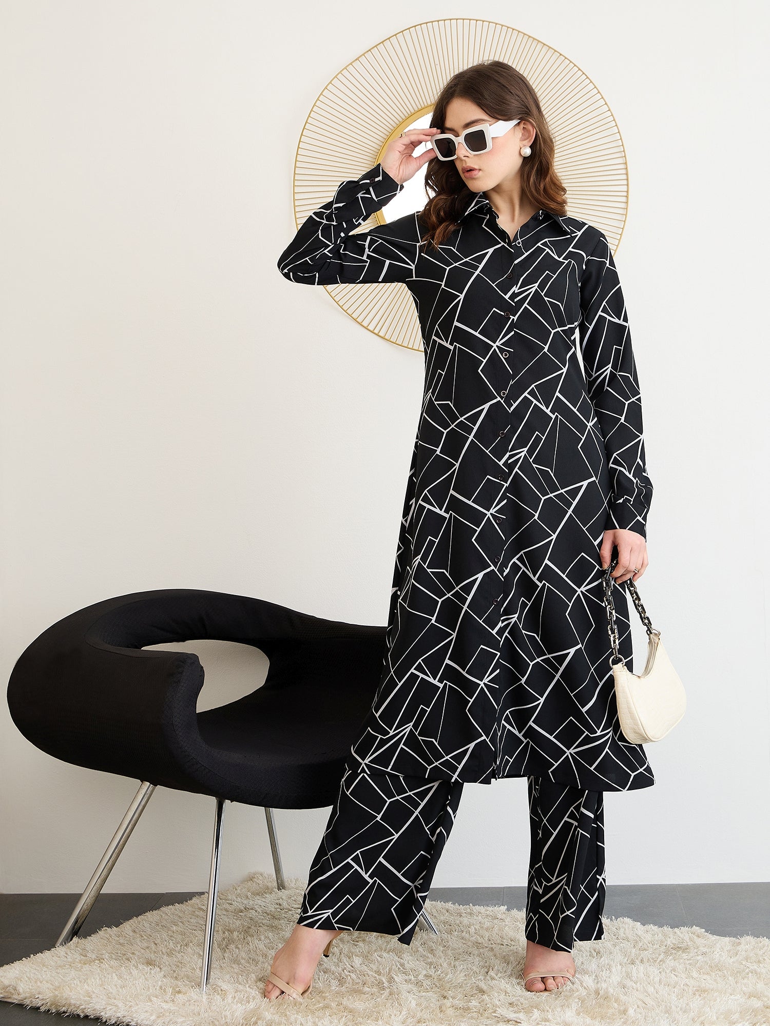 Berrylush BIZwear Women Black & White Abstract Printed Spread Collar Neck Button-Up Longline Top & Wide-Leg Maxi Trousers Co-Ords Set