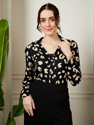 Berrylush BIZwear Women Black & Beige Animal Printed Spread Collar Neck Button-Up Straight Hem Regular Shirt