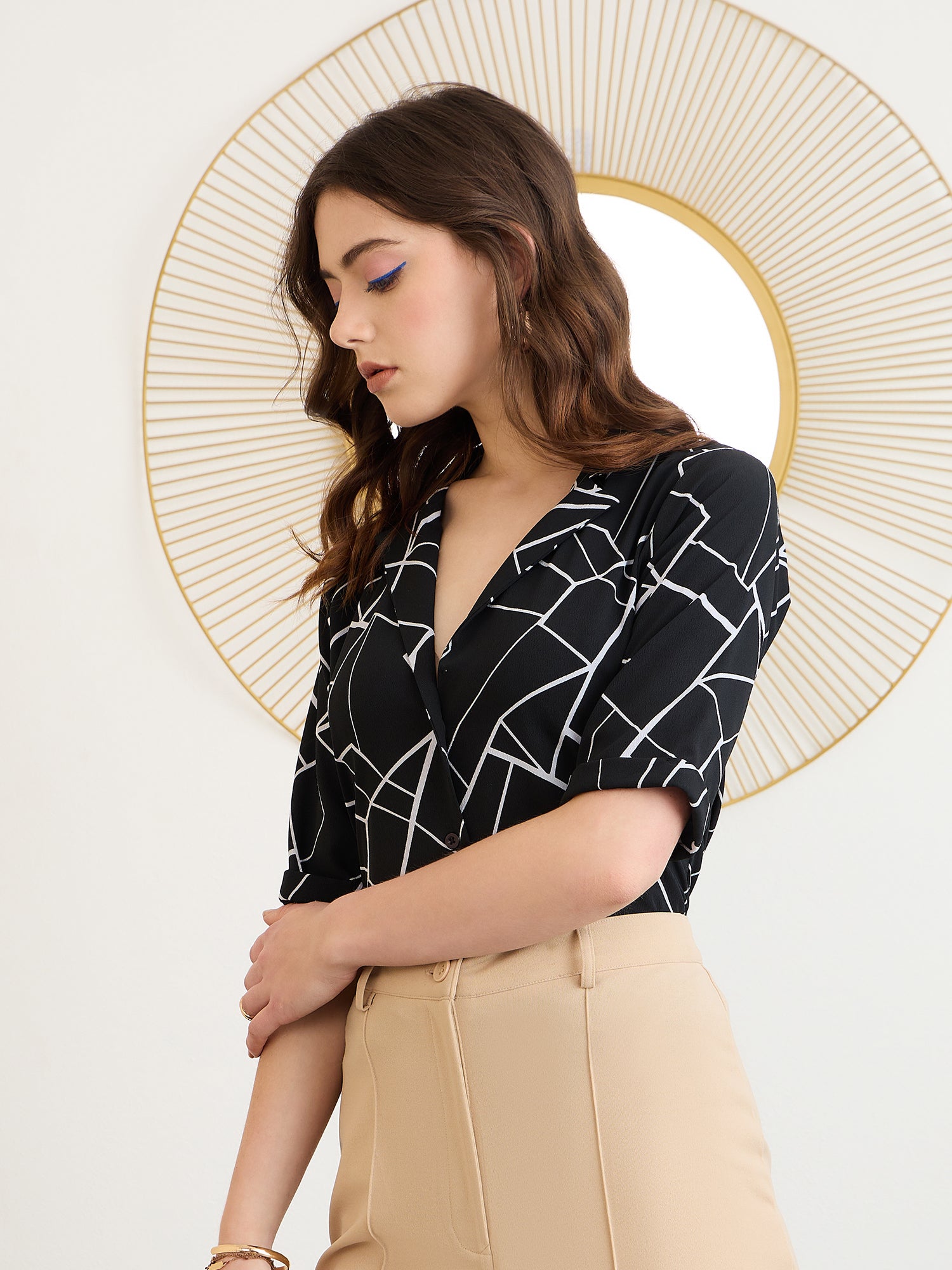 Berrylush BIZwear Women Black & White Geometric Printed Collar Neck Front Button Regular Top