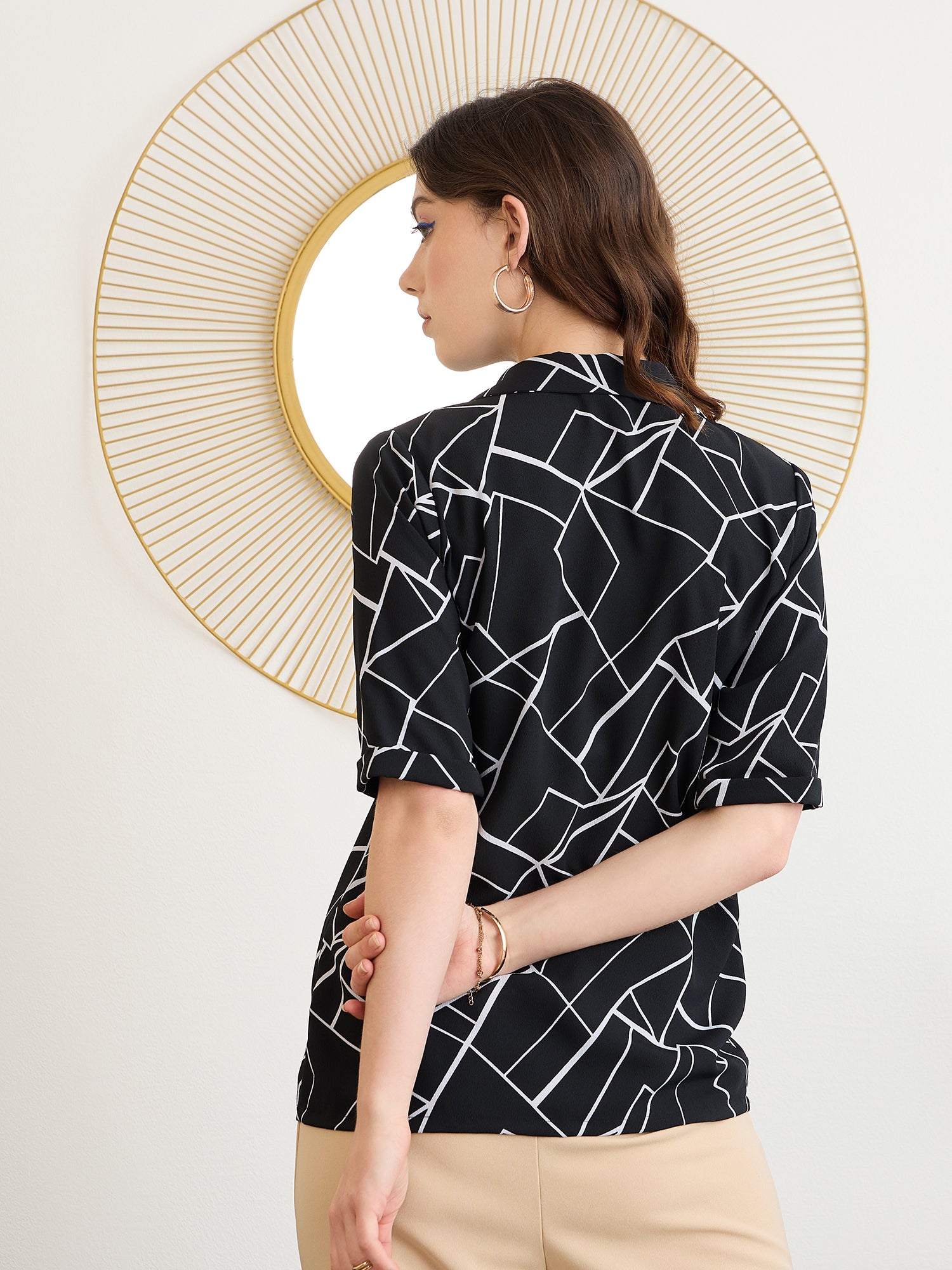 Step into the office with a sleek, modern edge in Berrylush BIZwear's Geometric Printed Collar Neck Top. This statement piece combines sharp black and white hues with an eye-catching geometric pattern to elevate your professional attire. Crafted from high-quality polyester, this top features a smart collar neckline and a convenient front button closure that ensures both comfort and style throughout the day. The regular fit and short sleeves maintain a classic look while offering ease of movement- Ideal for busy days at work or important meetings. Embrace sophistication and confidence in every stride with this impeccably styled formal top.
