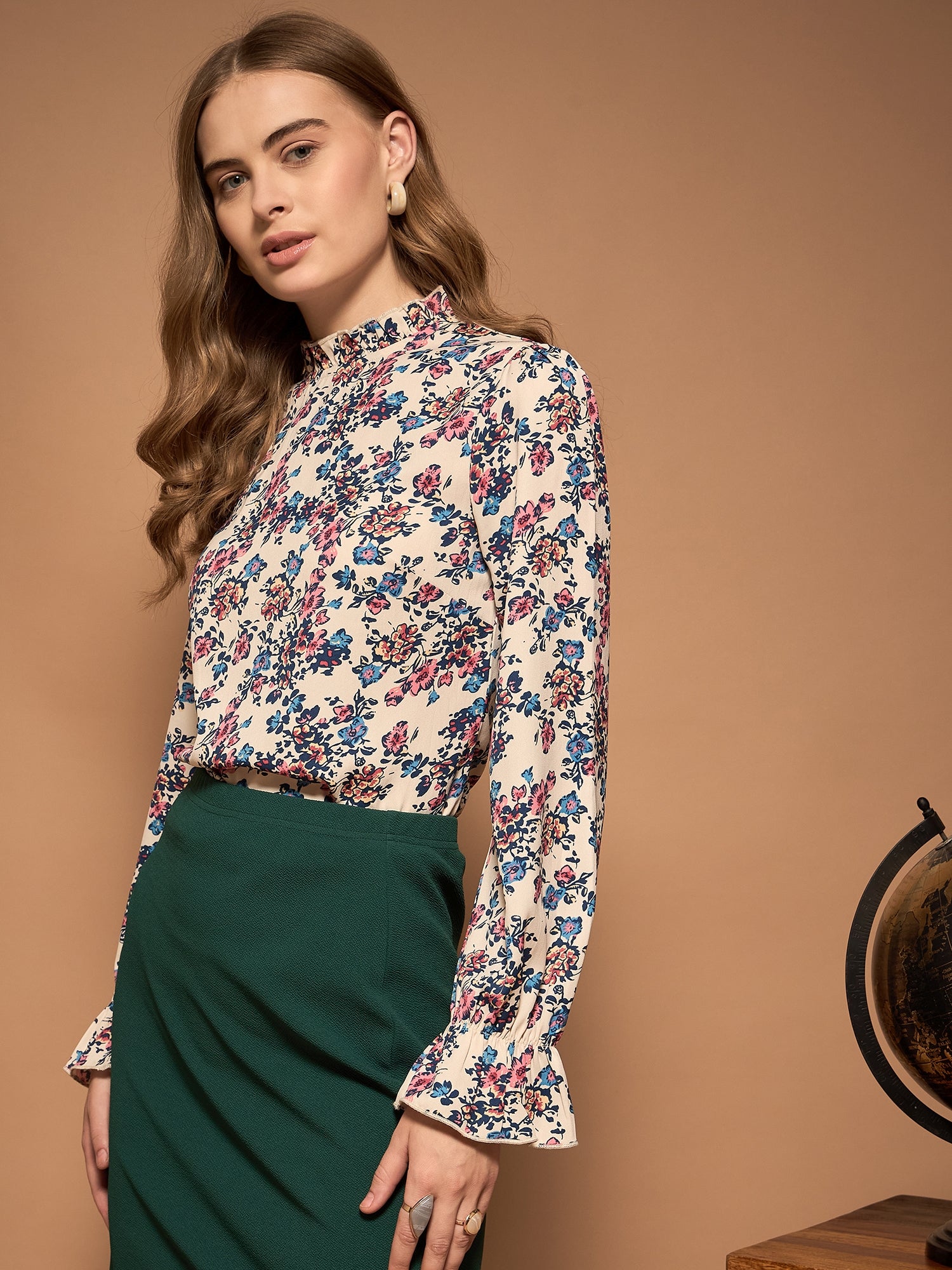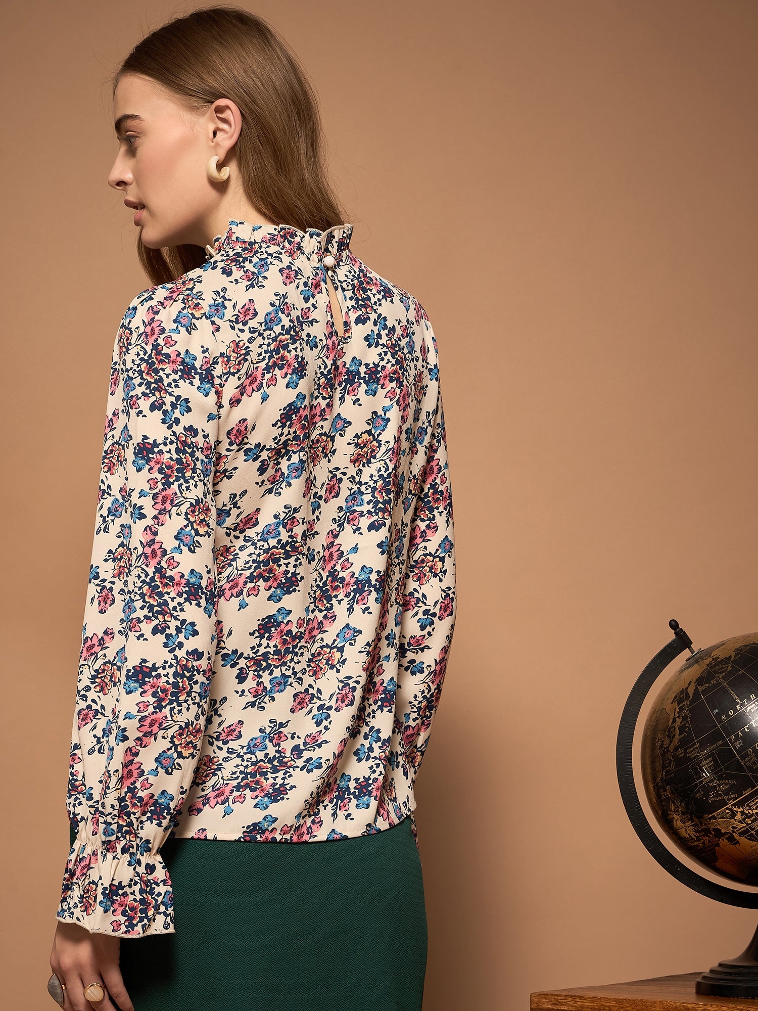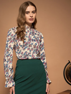 Introducing the latest in Berrylush BIZwear, this elegantly designed top combines utility and style that fits perfectly into your formal wardrobe. The White, Blue & Pink Floral Printed Stand Collar Neck Bishop Sleeves Back Keyhole Ruffled Regular Top strikes a delightful balance with its vibrant floral print on smooth polyester fabric. Its stand collar neckline and eye-catching bishop sleeves enhance your professional silhouette while maintaining comfort throughout the day. Delicate ruffles add a touch of femininity, complemented by an opaque finish for ease of wear. A back keyhole with button closure completes this essential piece offering both sophistication and practicality for any business setting.