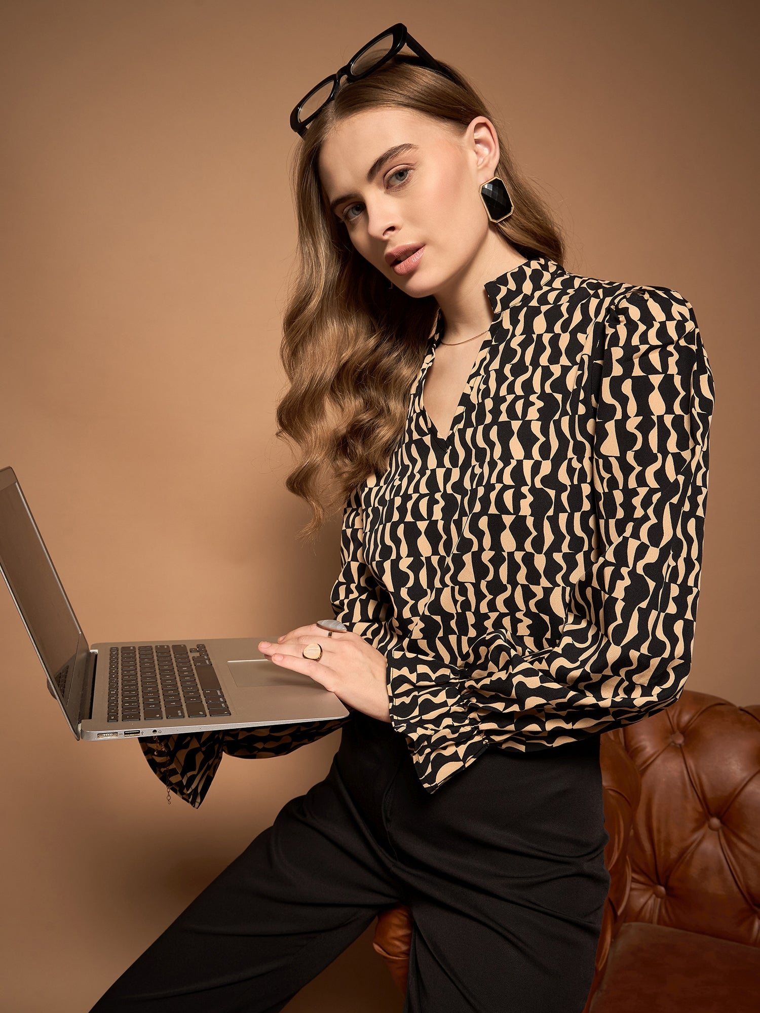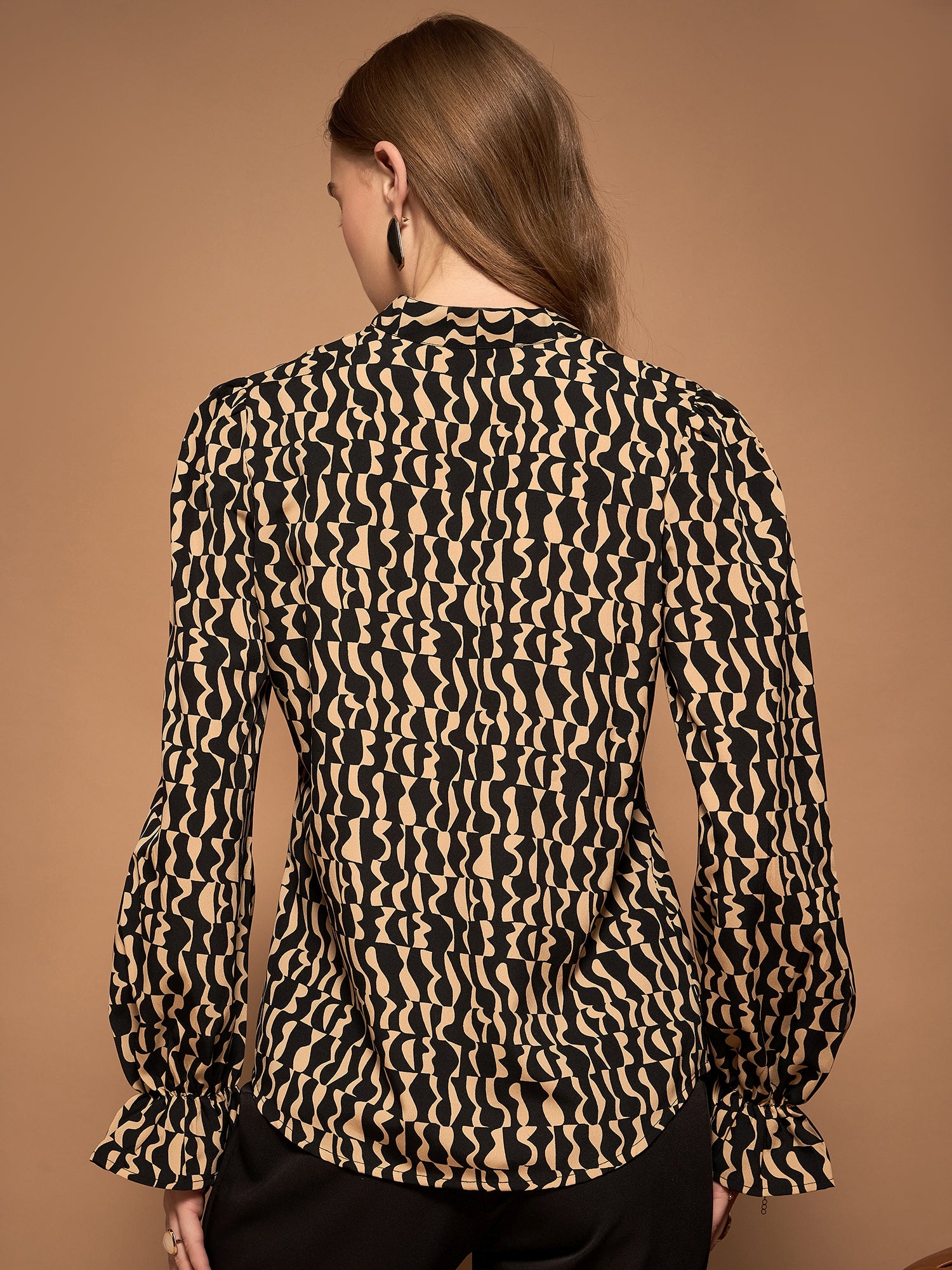 Berrylush BIZwear Women Black & Beige Abstract Printed V-Neck Bishop Sleeves Curved Hem Regular Top