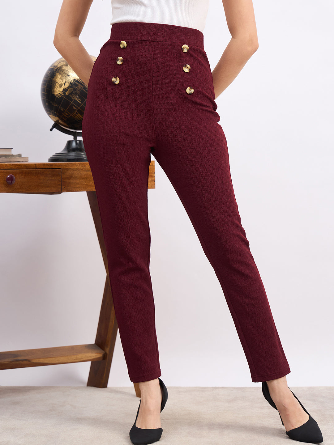 Berrylush BIZwear Women Solid Maroon High-Rise Waist Slip-On Button Embellish Knitted Maxi Trousers
