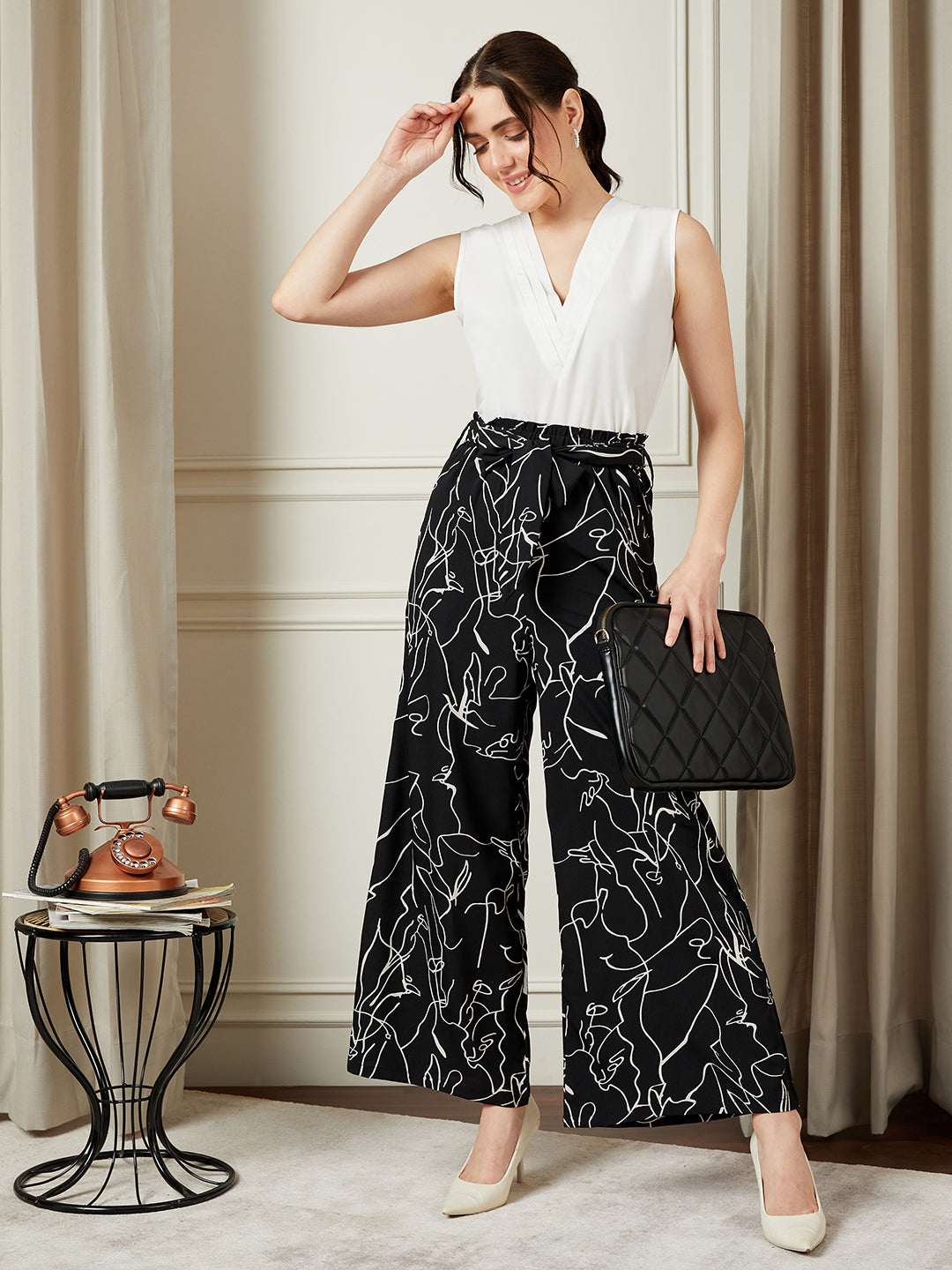 Berrylush BIZwear Women Black & White Abstract Printed Tie-Up Waist Slip-On Regular Parallel Trousers