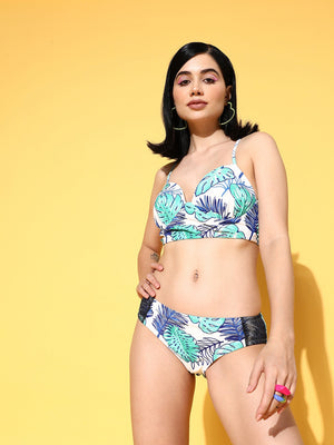 Berrylush Women White & Blue Tropical Printed Sweetheart Neck Sleeveless Racerback Bikini Set