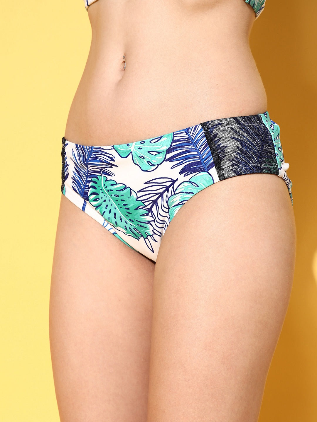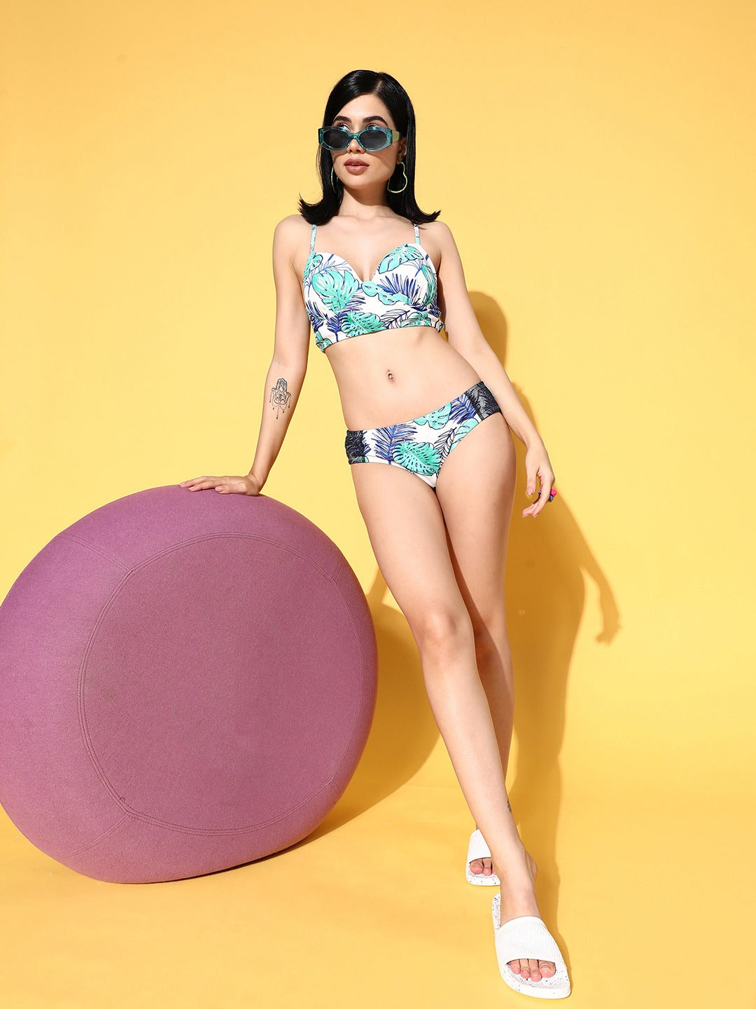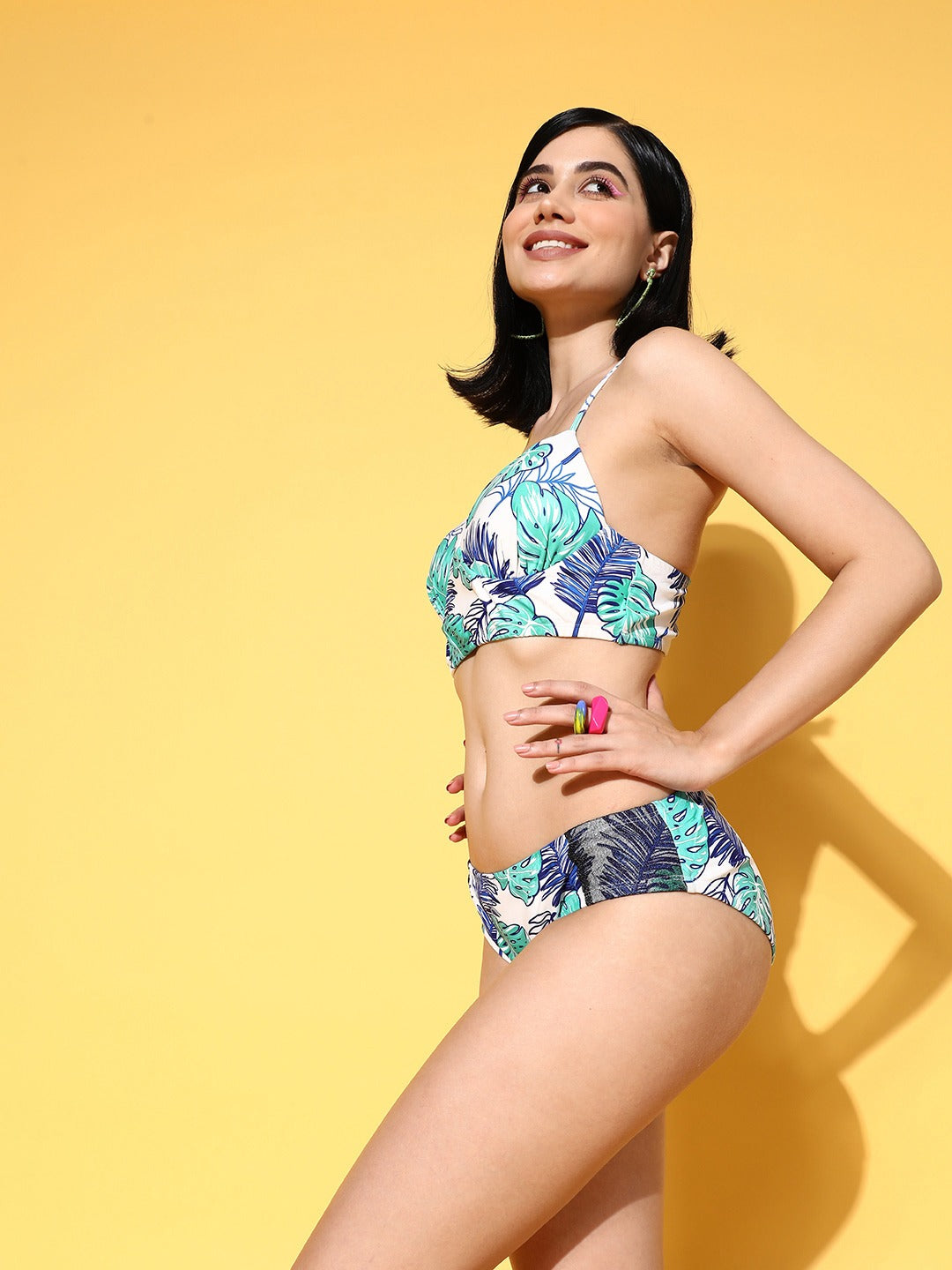 Summer is never complete with the love of captivating swimwear just like this bedazzling White and Blue Tropical Printed Bikini Set introduced by Berrylush. Punctuated from the finest polyester fabric that lends this bikini set absolute resistance from fading and shrinking issues after every wash. Elegantly designed with shoulder straps to give the bra a supportive silhouette with an alluring outline to your collarbones and shoulders. The modest-waisted brief offers conservative coverage to your waist with an enticing appeal to your natural curves. Team this bikini set with comfy sandals, blue sunglasses, a matching shrug, and a cute side bag for a fabulous appearance.