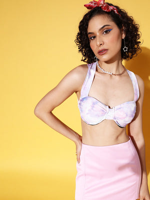 Indulge your vacation closet with a vibrant and voguish fashion statement by opting for this mesmerizing Multicolour Tie-Dye Bikini Swim Top from Berrylush. Highlighting sweetheart neck design that gives your neckline a shape resembling the top half of a heart along with a universally flattering style note to this top. Showing off tie-ups surfaces styling that offers size flexibility to this top with a form-fitting option and decorative detail. The criss-cross back design lends your back area a stylish and eye-catching detail. Pair this bikini swim top with a matching mini skirt, peal pendant, cute hoop earrings, a pair of chic sandals, and your favourite handbag to get a fashion-focused look.