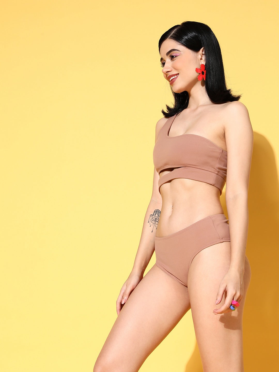 Berrylush Women Solid Brown One-Shoulder Neck Sleeveless Cutout Slip-On Swim Bikini Set