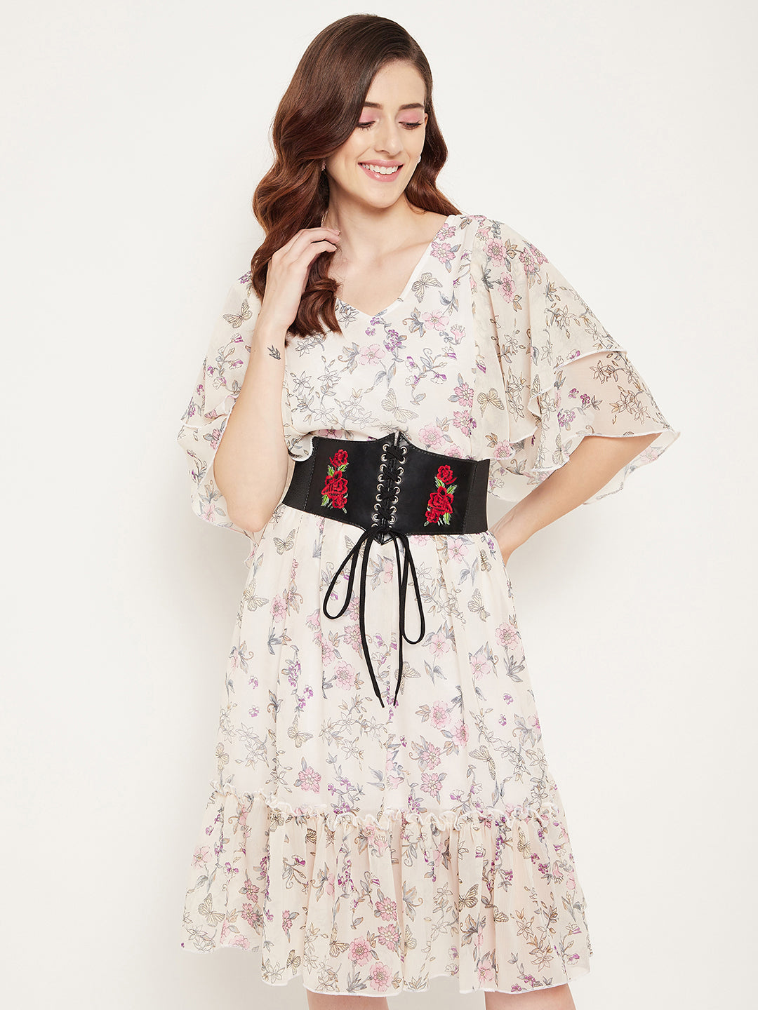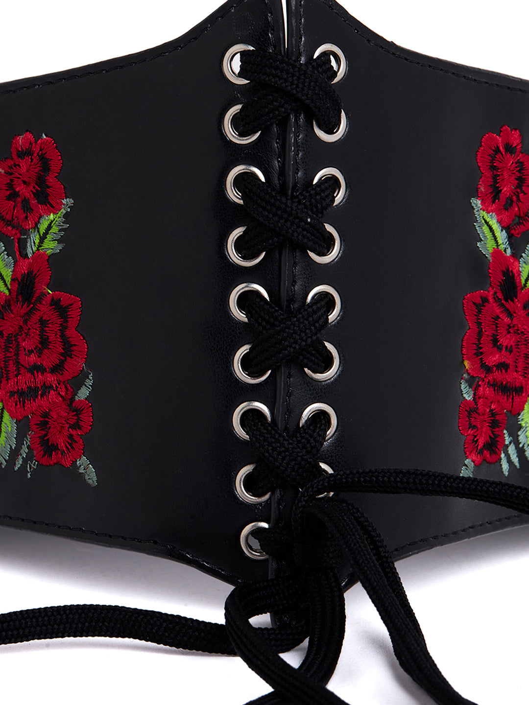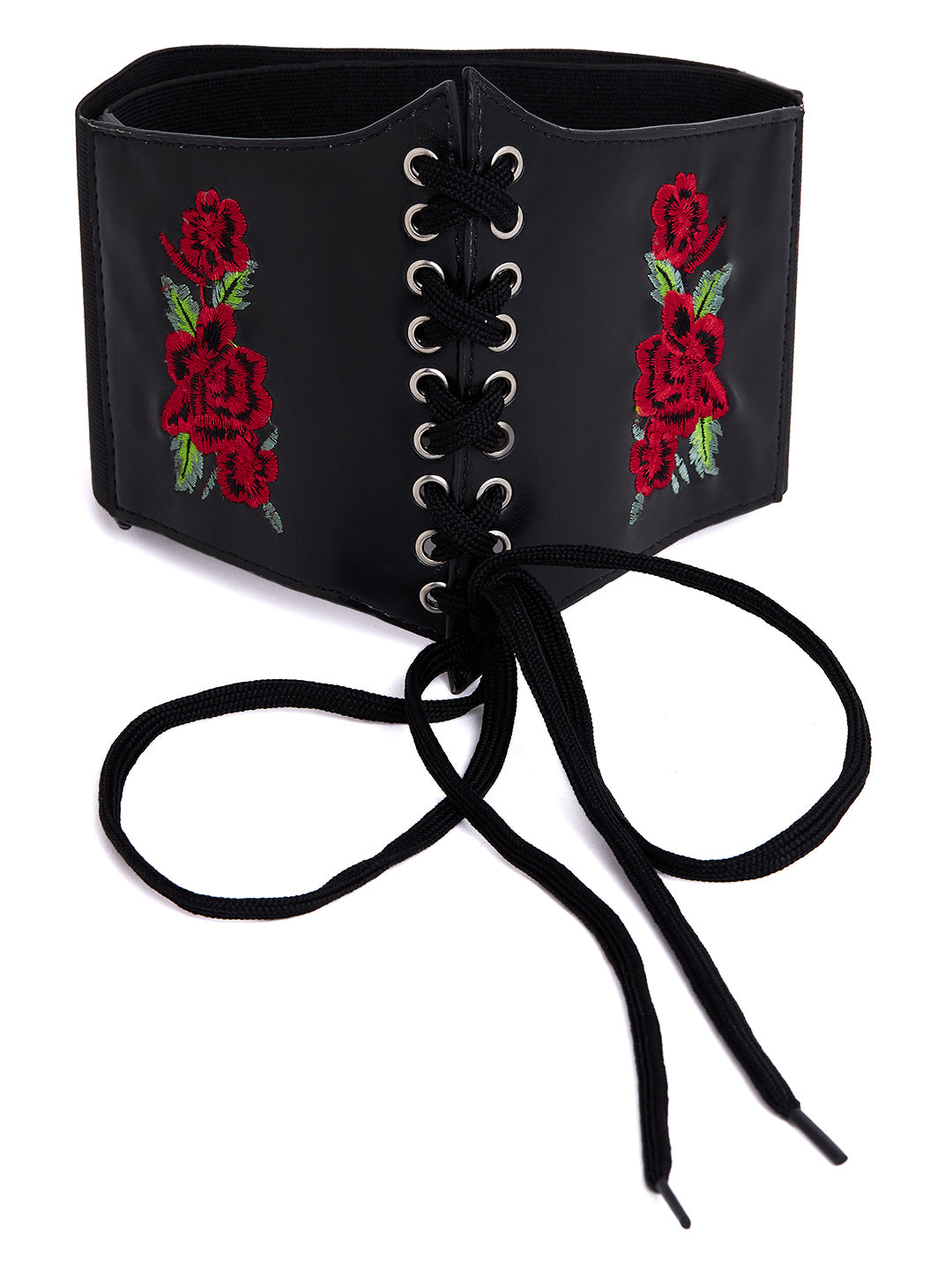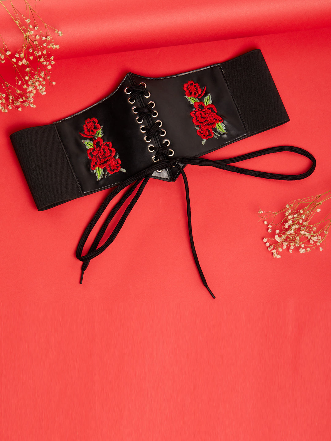 - A red floral embellished pattern adjoins a striking and eye-catching design to this belt