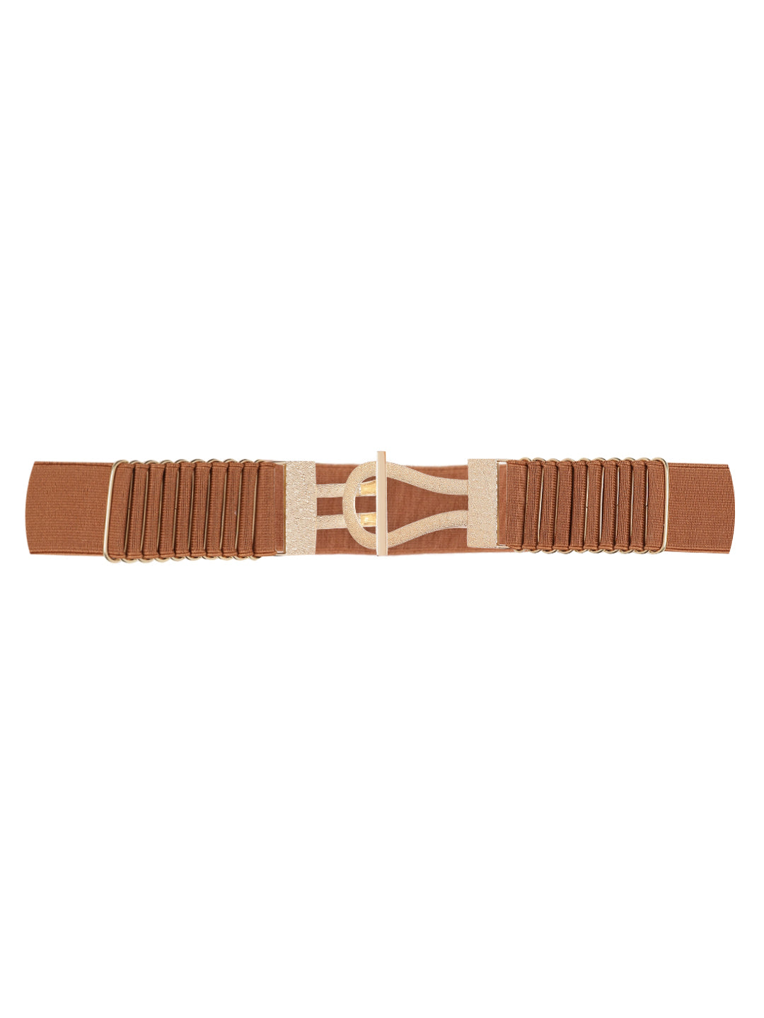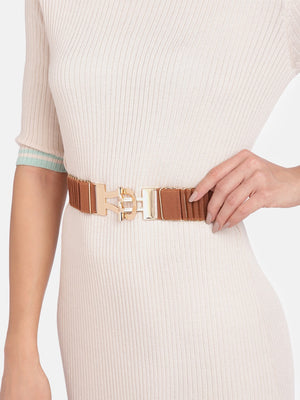 Berrylush Women Tan Brown Elastic Strap Double Pin Fancy Hook Belt