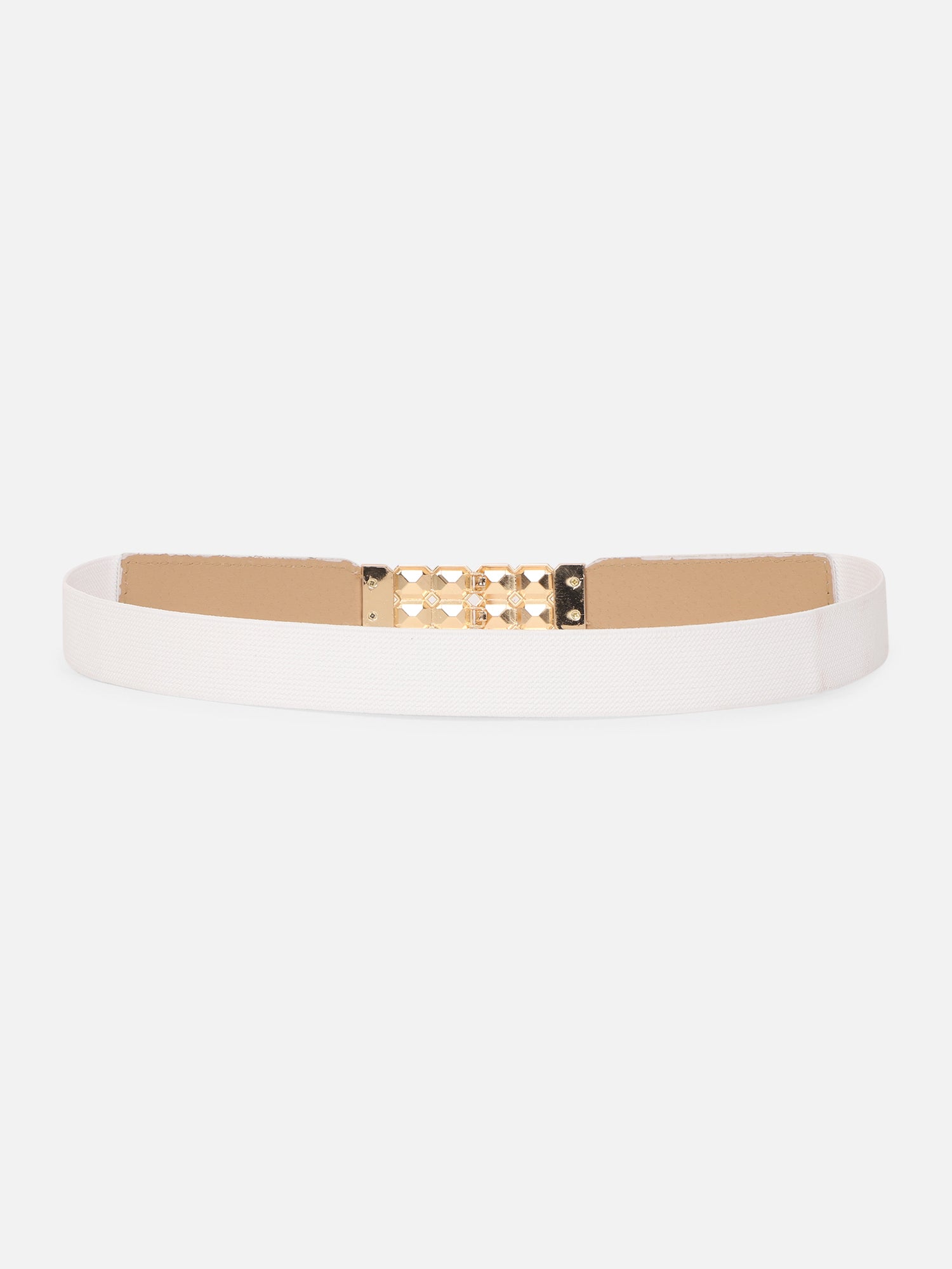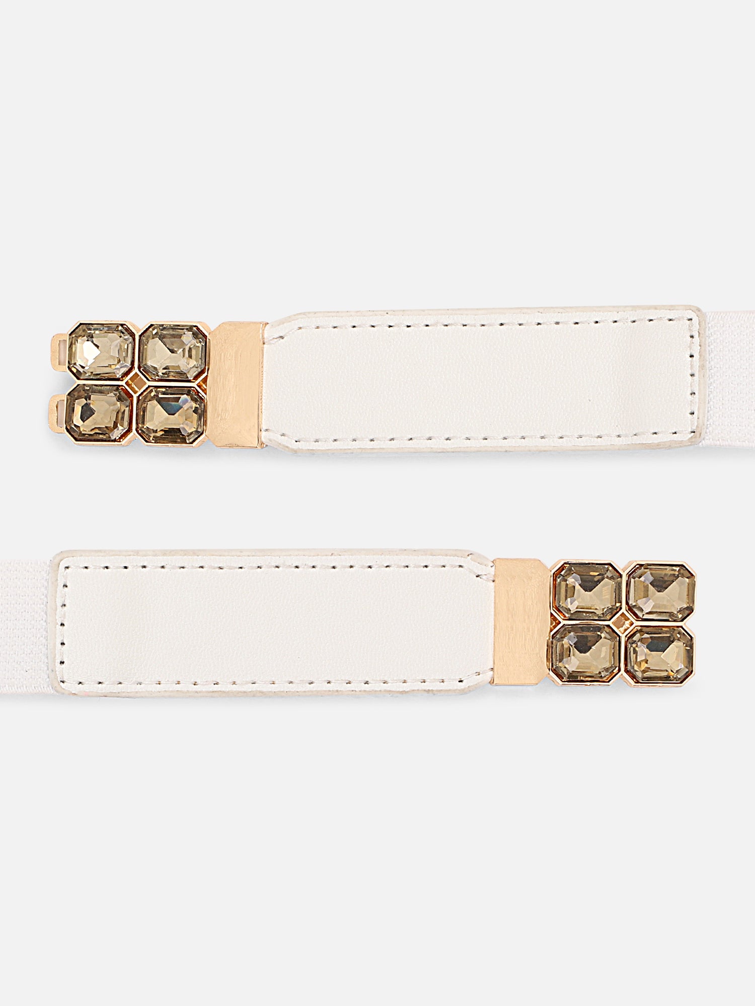 Dazzle up your casual outfit with minimalistic yet enchanting signature pieces just like this chic Solid White Diamond Embellished Regular Belt from the latest accessories collection of Berrylush. Featuring a stretchable strap that offers this belt astonishing elastic character and size flexibility for a comfortable yet contouring fit. The white shade gives this belt a classy and opulent appearance with a touch of sophistication. In addition, the solid pattern lends this belt a luxurious look and feel with a dose of modern and modish design. Create a fashion-focused look by pairing this belt with your flared dress, cute sandals, and a matching side bag.