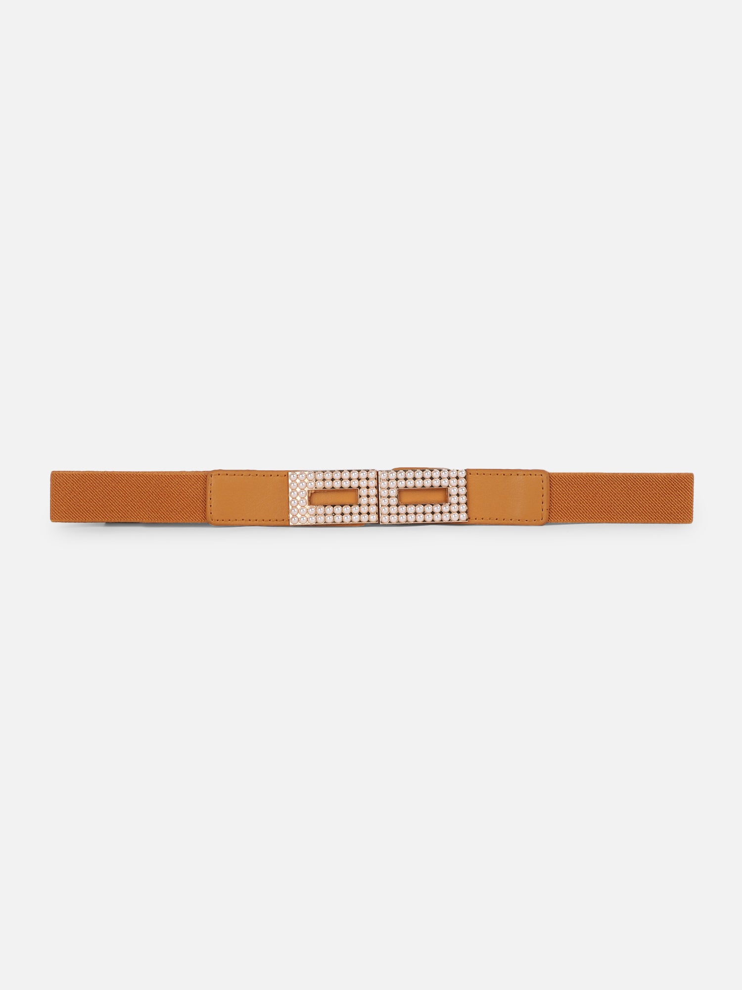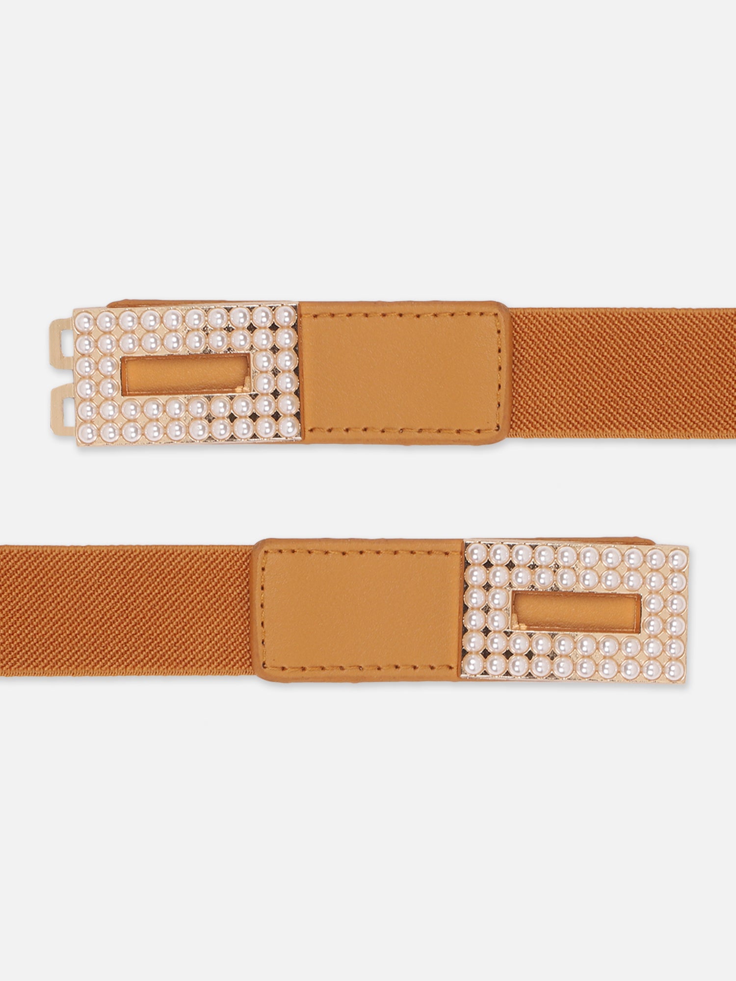 Get your hands on the trendiest and neutral contemporary style by picking this majestic Solid Brown Pearl Embellished Regular Belt introduced by Berrylush for its latest accessories collection. Presenting brown shade that gives this belt a classic and timeless appearance followed by a monochromatic vibe. The solid pattern lends this belt a dash of versatile design with a touch of sophistication for a fashion-focused fashion statement. Also, the stretchable strap offers this belt size adaptability with astonishing flexible and elastic nature for a comfy yet figure-hugging fit to outshine your natural curves. Shower yourself with compliments by teaming this belt with your black dress to create a stunning look.